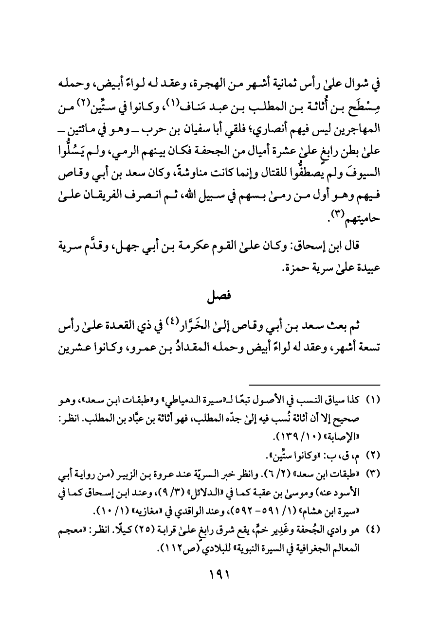 (¬٣) «طبقات ابن سعد» (٢/ ٦). وانظر خبر السريّة عند عروة بن الزبير (من رواية أبي الأسود عنه) وموسى بن عقبة كما في «الدلائل» (٣/ ٩)، وعند ابن إسحاق كما في «سيرة ابن هشام» (١/ ٥٩١ - ٥٩٢)، وعند الواقدي في «مغازيه» (١/ ١٠).
