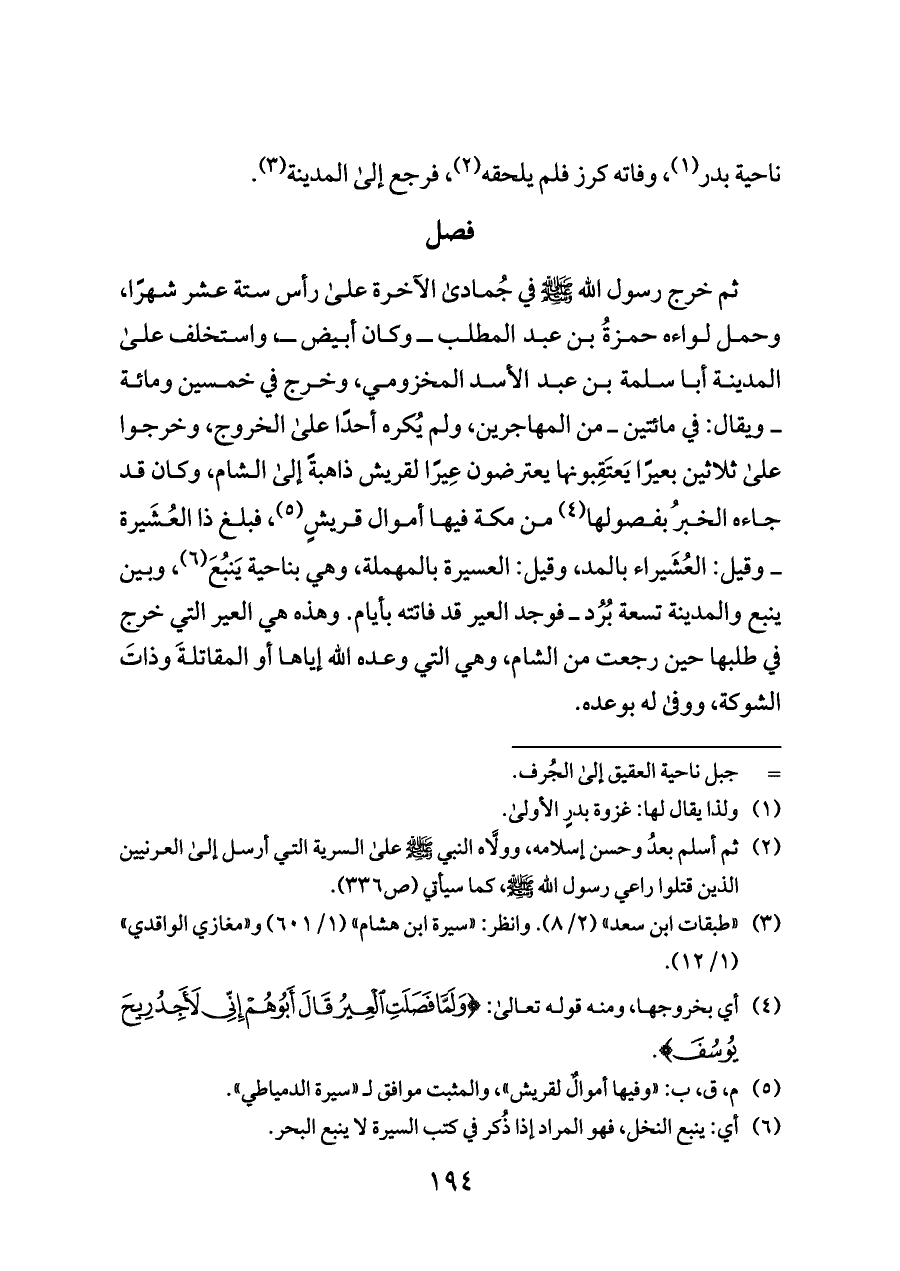 ثم خرج رسول الله - صلى الله عليه وسلم - في جُمادى الآخرة على رأس ستة عشر شهرًا، وحمل لواءه حمزةُ بن عبد المطلب ــ وكان أبيض ــ، واستخلف على المدينة أبا سلمة بن عبد الأسد المخزومي، وخرج في خمسين ومائة ــ ويقال: في مائتين ــ من المهاجرين، ولم يُكره أحدًا على الخروج، وخرجوا على ثلاثين بعيرًا يَعتَقِبونها يعترضون عِيرًا لقريش ذاهبةً إلى الشام، وكان قد جاءه الخبرُ بفصولها (¬٤) من مكة فيها أموال قريشٍ (¬٥)، فبلغ ذا العُشَيرة ــ وقيل: العُشَيراء بالمد، وقيل: العسيرة بالمهملة، وهي بناحية يَنبُعَ (¬٦)، وبين ينبع والمدينة تسعة بُرُد ــ فوجد العير قد فاتته بأيام. وهذه هي العير التي خرج في طلبها حين رجعت من الشام، وهي التي وعده الله إياها أو المقاتلةَ وذاتَ الشوكة، ووفى له بوعده.