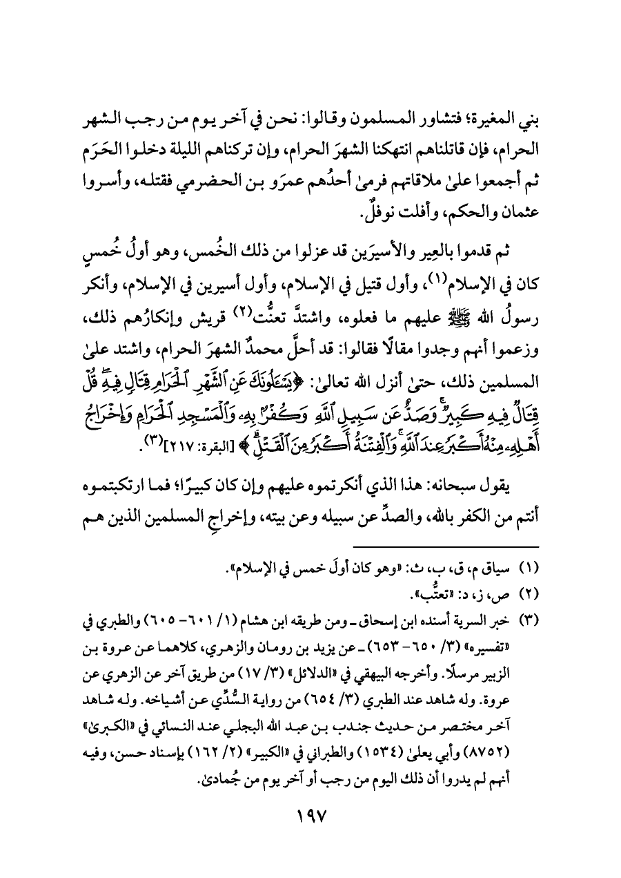 (¬٣) خبر السرية أسنده ابن إسحاق ــ ومن طريقه ابن هشام (١/ ٦٠١ - ٦٠٥) والطبري في «تفسيره» (٣/ ٦٥٠ - ٦٥٣) ــ عن يزيد بن رومان والزهري، كلاهما عن عروة بن الزبير مرسلًا. وأخرجه البيهقي في «الدلائل» (٣/ ١٧) من طريق آخر عن الزهري عن عروة. وله شاهد عند الطبري (٣/ ٦٥٤) من رواية السُّدِّي عن أشياخه. وله شاهد آخر مختصر من حديث جندب بن عبد الله البجلي عند النسائي في «الكبرى» (٨٧٥٢) وأبي يعلى (١٥٣٤) والطبراني في «الكبير» (٢/ ١٦٢) بإسناد حسن، وفيه أنهم لم يدروا أن ذلك اليوم من رجب أو آخر يوم من جُمادى.