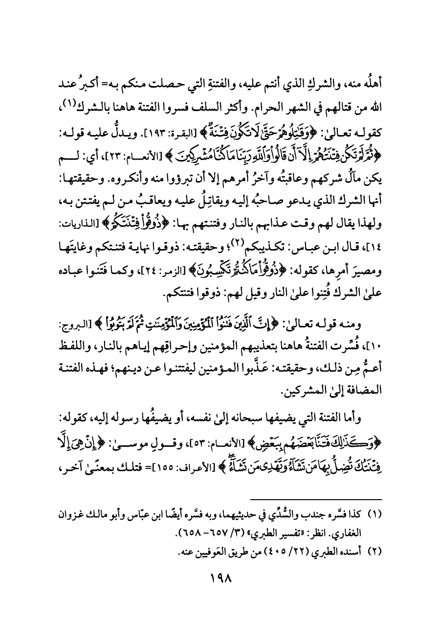 أهلُه منه، والشركِ الذي أنتم عليه، والفتنةِ التي حصلت منكم به= أكبرُ عند الله من قتالهم في الشهر الحرام. وأكثر السلف فسروا الفتنة هاهنا بالشرك (¬١)، كقوله تعالى: {وَقَاتِلُوهُمْ حَتَّى لَا تَكُونَ فِتْنَةٌ} [البقرة: ١٩٣]. ويدلُّ عليه قوله: {ثُمَّ لَمْ تَكُنْ فِتْنَتُهُمْ إِلَّا أَنْ قَالُوا وَاللَّهِ رَبِّنَا مَا كُنَّا مُشْرِكِينَ} [الأنعام: ٢٣]، أي: لم يكن مآلُ شركهم وعاقبتُه وآخرُ أمرهم إلا أن تبرؤوا منه وأنكروه. وحقيقتها: أنها الشرك الذي يدعو صاحبُه إليه ويقاتِلُ عليه ويعاقبُ من لم يفتتن به، ولهذا يقال لهم وقت عذابهم بالنار وفتنتهم بها: {ذُوقُوا فِتْنَتَكُمْ} [الذاريات: ١٤]، قال ابن عباس: تكذيبكم (¬٢)؛ وحقيقته: ذوقوا نهاية فتنتكم وغايتَها ومصيرَ أمرِها، كقوله: {ذُوقُوا مَا كُنْتُمْ تَكْسِبُونَ} [الزمر: ٢٤]، وكما فَتَنوا عباده على الشرك فُتِنوا على النار وقيل لهم: ذوقوا فتنتكم.