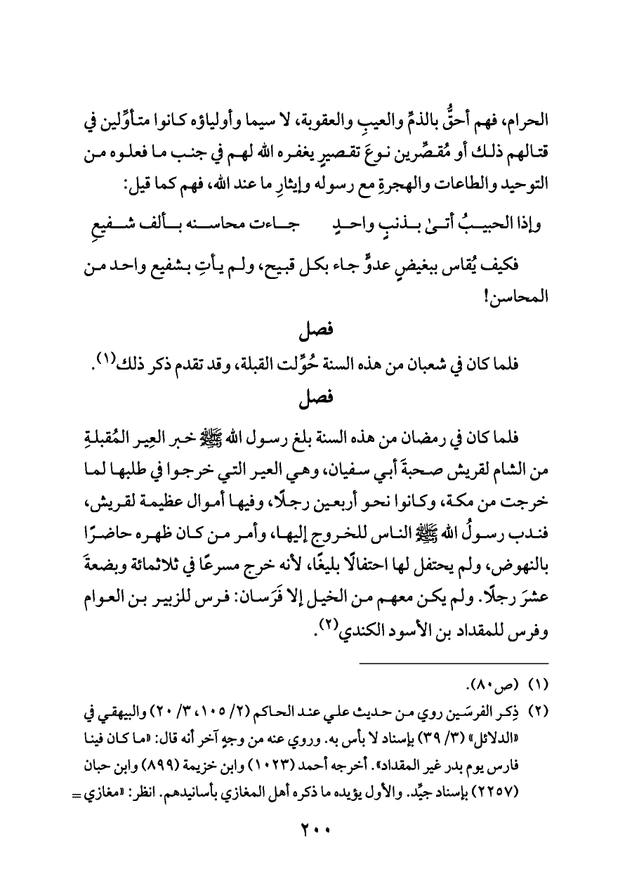 (¬٢) ذِكر الفرسَين روي من حديث علي عند الحاكم (٢/ ١٠٥، ٣/ ٢٠) والبيهقي في «الدلائل» (٣/ ٣٩) بإسناد لا بأس به. وروي عنه من وجهٍ آخر أنه قال: «ما كان فينا فارس يوم بدر غير المقداد». أخرجه أحمد (١٠٢٣) وابن خزيمة (٨٩٩) وابن حبان (٢٢٥٧) بإسناد جيِّد. والأول يؤيده ما ذكره أهل المغازي بأسانيدهم. انظر: «مغازي الواقدي» (١/ ٢٧) و «طبقات ابن سعد» (٢/ ٢١).