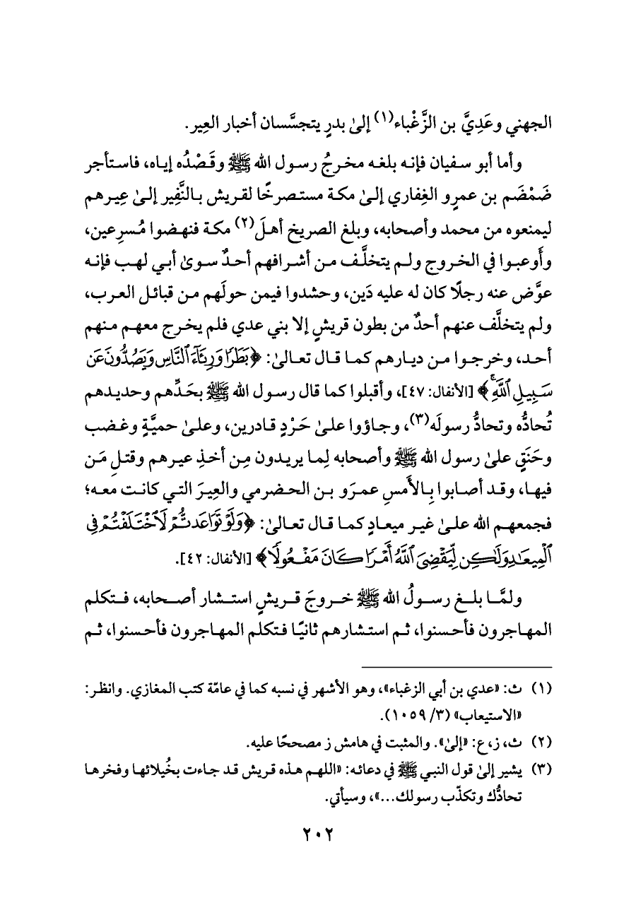 وأما أبو سفيان فإنه بلغه مخرجُ رسول الله - صلى الله عليه وسلم - وقَصْدُه إياه، فاستأجر ضَمْضَم بن عمرٍو الغِفاري إلى مكة مستصرخًا لقريش بالنَّفِير إلى عِيرهم ليمنعوه من محمد وأصحابه، وبلغ الصريخ أهلَ (¬٢) مكة فنهضوا مُسرِعين، وأَوعبوا في الخروج ولم يتخلَّف من أشرافهم أحدٌ سوى أبي لهب فإنه عوَّض عنه رجلًا كان له عليه دَين، وحشدوا فيمن حولَهم من قبائل العرب، ولم يتخلَّف عنهم أحدٌ من بطون قريشٍ إلا بني عدي فلم يخرج معهم منهم أحد، وخرجوا من ديارهم كما قال تعالى: {بَطَرًا وَرِئَاءَ النَّاسِ وَيَصُدُّونَ عَنْ سَبِيلِ اللَّهِ} [الأنفال: ٤٧]، وأقبلوا كما قال رسول الله - صلى الله عليه وسلم - بحَدِّهم وحديدهم تُحادُّه وتحادُّ رسولَه (¬٣)، وجاؤوا على حَرْدٍ قادرين، وعلى حميَّةٍ وغضب وحَنَقٍ على رسول الله - صلى الله عليه وسلم - وأصحابه لِما يريدون مِن أخذِ عيرهم وقتلِ مَن فيها، وقد أصابوا بِالأَمسِ عمرَو بن الحضرمي والعِيرَ التي كانت معه؛ فجمعهم الله على غير ميعادٍ كما قال تعالى: {وَلَوْ تَوَاعَدْتُمْ لَاخْتَلَفْتُمْ فِي الْمِيعَادِ وَلَكِنْ لِيَقْضِيَ اللَّهُ أَمْرًا كَانَ} [الأنفال: ٤٢].