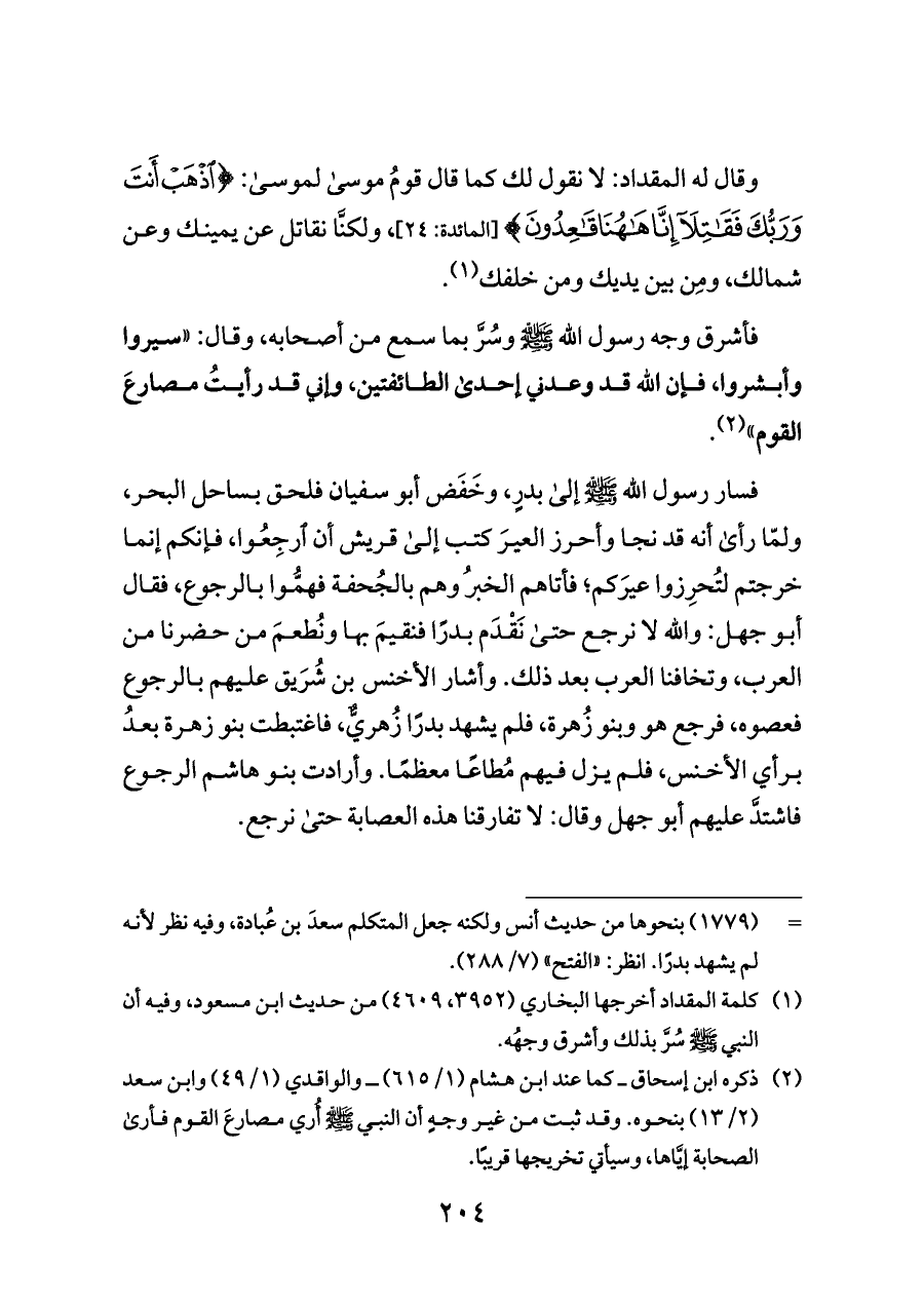 (¬١) كلمة المقداد أخرجها البخاري (٣٩٥٢، ٤٦٠٩) من حديث ابن مسعود، وفيه أن النبي - صلى الله عليه وسلم - سُرَّ بذلك وأشرق وجهُه.