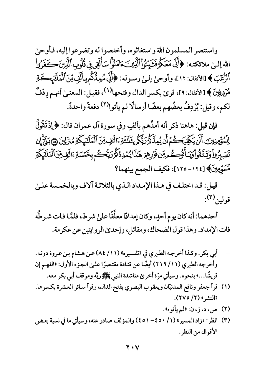 قيل: قد اختلف في هذا الإمداد الذي بالثلاثة آلاف وبالخمسة على قولين (¬٣):