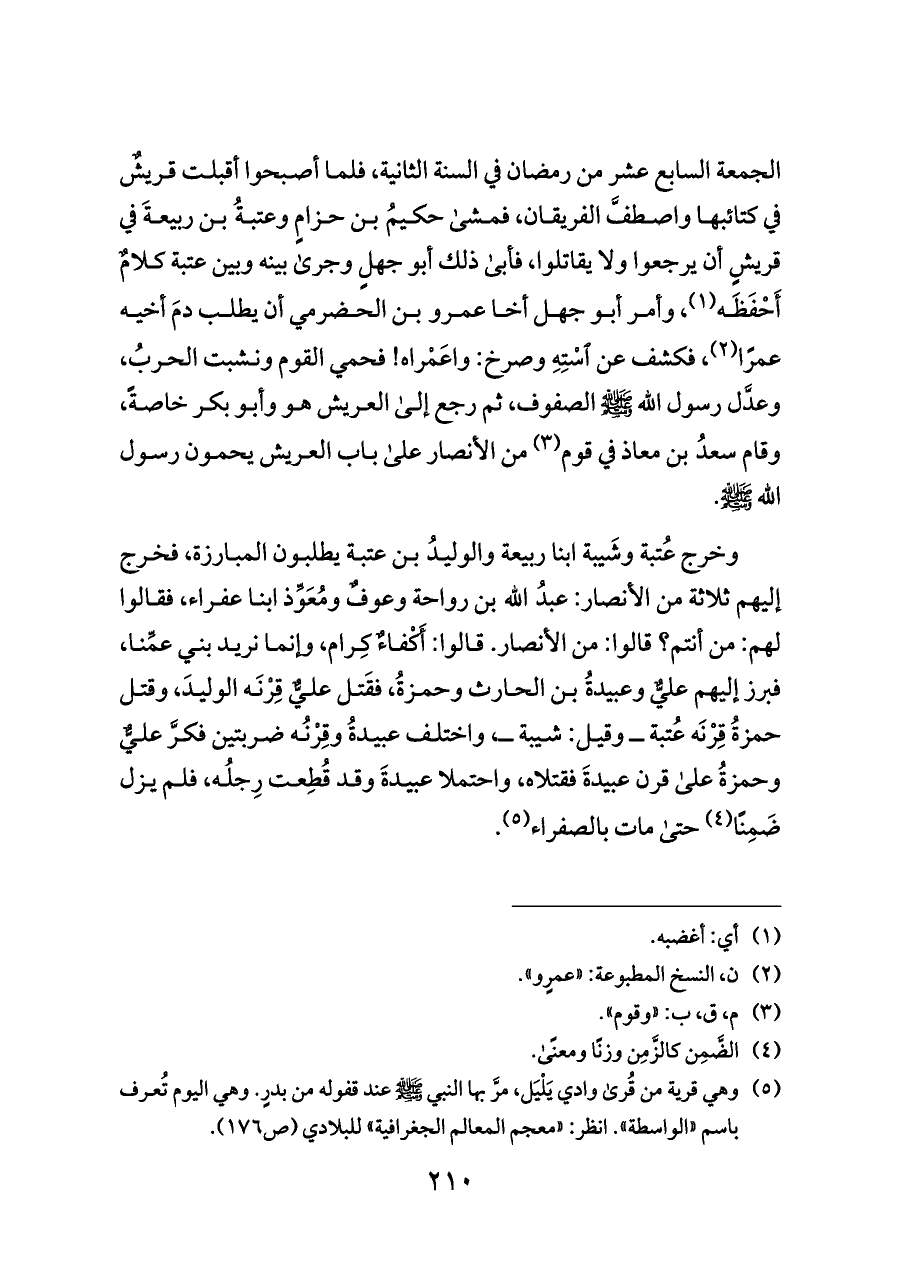 وخرج عُتبة وشَيبة ابنا ربيعة والوليدُ بن عتبة يطلبون المبارزة، فخرج إليهم ثلاثة من الأنصار: عبدُ الله بن رواحة وعوفٌ ومُعَوِّذ ابنا عفراء، فقالوا لهم: من أنتم؟ قالوا: من الأنصار. قالوا: أَكْفاءٌ كِرام، وإنما نريد بني عمِّنا، فبرز إليهم عليٌّ وعبيدةُ بن الحارث وحمزةُ، فقَتل عليٌّ قِرْنَه الوليدَ، وقتل حمزةُ قِرْنَه عُتبة ــ وقيل: شيبة ــ، واختلف عبيدةُ وقِرْنُه ضربتين فكرَّ عليٌّ وحمزةُ على قرن عبيدةَ فقتلاه، واحتملا عبيدةَ وقد قُطِعت رِجلُه، فلم يزل ضَمِنًا (¬٤) حتى مات بالصفراء (¬٥).