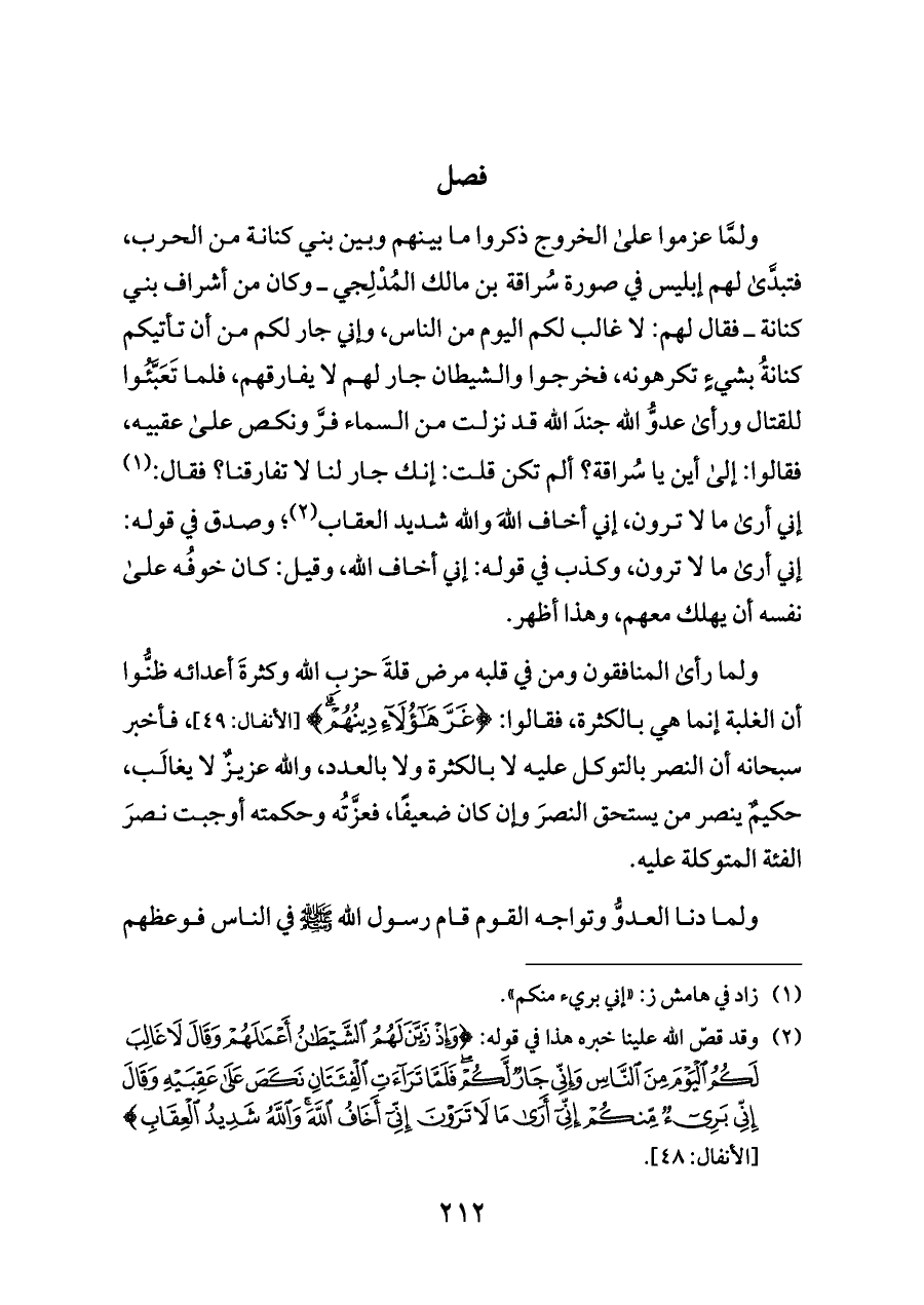 ولمَّا عزموا على الخروج ذكروا ما بينهم وبين بني كنانة من الحرب، فتبدَّى لهم إبليس في صورة سُراقة بن مالك المُدْلِجي ــ وكان من أشراف بني كنانة ــ فقال لهم: لا غالب لكم اليوم من الناس، وإني جار لكم من أن تأتيكم كنانةُ بشيءٍ تكرهونه، فخرجوا والشيطان جار لهم لا يفارقهم، فلما تَعَبَّئُوا للقتال ورأى عدوُّ الله جندَ الله قد نزلت من السماء فرَّ ونكص على عقبيه، فقالوا: إلى أين يا سُراقة؟ ألم تكن قلت: إنك جار لنا لا تفارقنا؟ فقال: (¬١) إني أرى ما لا ترون، إني أخاف اللهَ والله شديد العقاب (¬٢)؛ وصدق في قوله: إني أرى ما لا ترون، وكذب في قوله: إني أخاف الله، وقيل: كان خوفُه على نفسه أن يهلك معهم، وهذا أظهر.