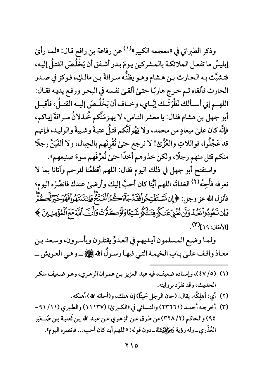 وذكر الطبراني في «معجمه الكبير» (¬١) عن رفاعة بن رافع قال: «لما رأى إبليسُ ما تفعل الملائكة بالمشركين يومَ بدر أشفق أن يَخْلُصَ القتلُ إليه، فتشبَّث به الحارث بن هشام وهو يظنُّه سراقةَ بن مالكٍ، فوكز في صدر الحارث فألقاه ثم خرج هاربًا حتى ألقى نفسه في البحر ورفع يديه فقال: اللهم إني أسألك نَظْرَتَك إيَّاي، وخاف أن يَخْلُصَ إليه القتلُ، فأقبل أبو جهل بن هشام فقال: يا معشر الناس، لا يهزمَنَّكم خُذلانُ سراقةَ إياكم، فإنَّه كان على ميعادٍ من محمد، ولا يَهُولَنَّكم قتلُ عتبةَ وشيبةَ والوليد، فإنهم قد عَجَّلُوا، فواللاتِ والعُزَّى! لا نرجع حتى نُقْرِنَهم بالحِبال، ولا ألفَيَنَّ رجلًا منكم قتل منهم رجلًا، ولكن خذوهم أخذًا حتى نُعرِّفَهم سوءَ صنيعهم».