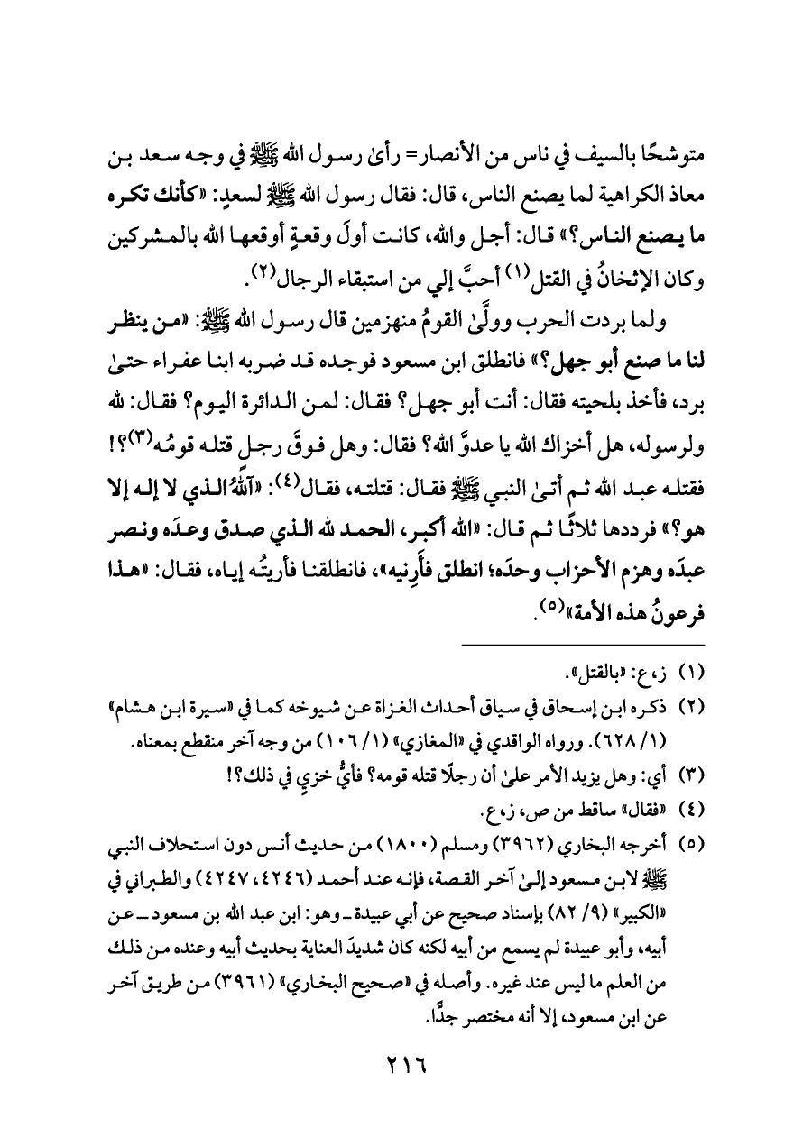 ولما بردت الحرب وولَّى القومُ منهزمين قال رسول الله - صلى الله عليه وسلم -: «من ينظر لنا ما صنع أبو جهل؟» فانطلق ابن مسعود فوجده قد ضربه ابنا عفراء حتى برد، فأخذ بلحيته فقال: أنت أبو جهل؟ فقال: لمن الدائرة اليوم؟ فقال: لله ولرسوله، هل أخزاك الله يا عدوَّ الله؟ فقال: وهل فوقَ رجلٍ قتله قومُه (¬٣)؟! فقتله عبد الله ثم أتى النبي - صلى الله عليه وسلم - فقال: قتلته، فقال (¬٤): «آللهُ الذي لا إله إلا هو؟» فرددها ثلاثًا ثم قال: «الله أكبر، الحمد لله الذي صدق وعدَه ونصر عبدَه وهزم الأحزاب وحدَه؛ انطلق فأَرِنيه»، فانطلقنا فأريتُه إياه، فقال: «هذا فرعونُ هذه الأمة» (¬٥).