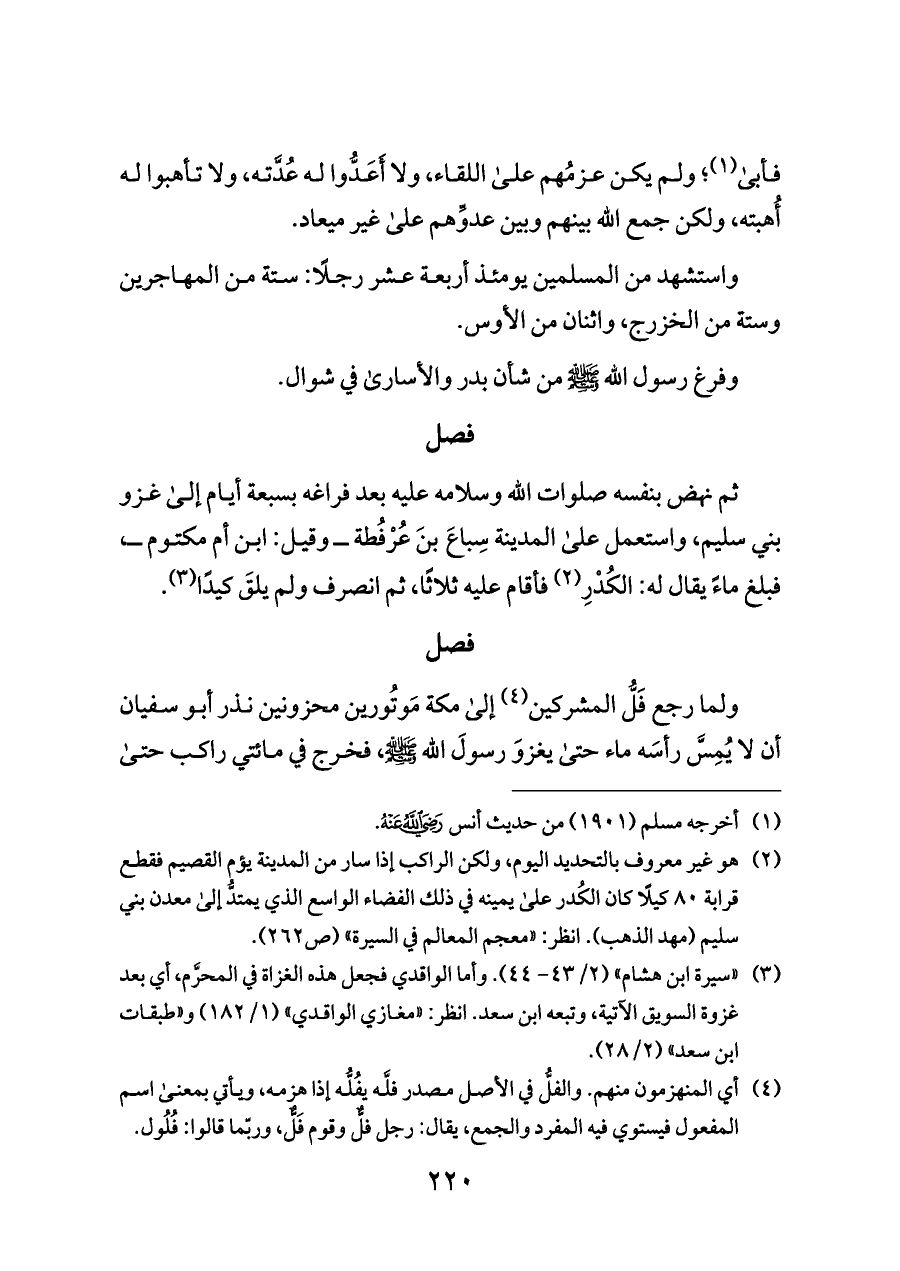 (¬٣) «سيرة ابن هشام» (٢/ ٤٣ - ٤٤). وأما الواقدي فجعل هذه الغزاة في المحرَّم، أي بعد غزوة السويق الآتية، وتبعه ابن سعد. انظر: «مغازي الواقدي» (١/ ١٨٢) و «طبقات ابن سعد» (٢/ ٢٨).