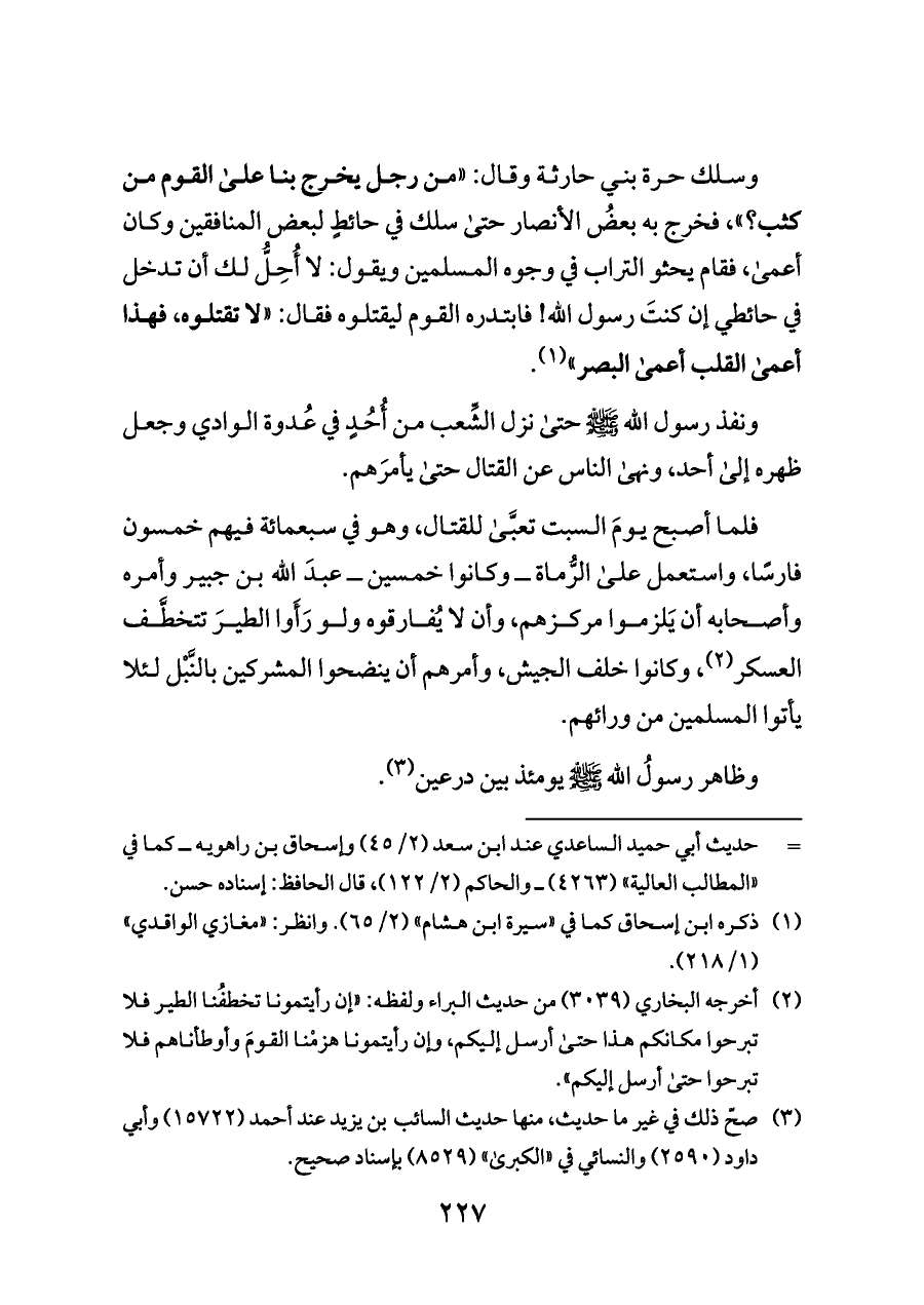 ونفذ رسول الله - صلى الله عليه وسلم - حتى نزل الشِّعب من أُحُدٍ في عُدوة الوادي وجعل ظهره إلى أحد، ونهى الناس عن القتال حتى يأمرَهم.