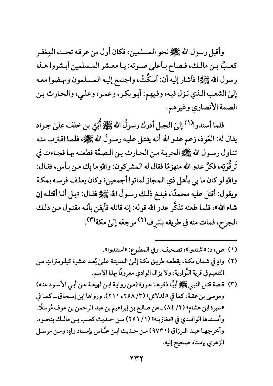 فلما أسندوا (¬١) إلى الجبل أدرك رسولُ الله - صلى الله عليه وسلم - أُبَيَّ بن خلف على جواد يقال له: العَوذ، زعم عدو الله أنه يقتل عليه رسولَ الله - صلى الله عليه وسلم -، فلما اقترب منه تناول رسول الله - صلى الله عليه وسلم - الحربة من الحارث بن الصمَّة فطعنه بها فجاءت في تَرقُوَتِه، فكرَّ عدو الله منهزمًا فقال له المشركون: واللهِ ما بك من بأس، فقال: واللهِ لو كان ما بي بأهل ذي المجاز لماتوا أجمعين؛ وكان يعلف فرسه بمكة ويقول: أقتل عليه محمدًا، فبلغ ذلك رسولَ الله - صلى الله عليه وسلم - فقال: «بل أنا أقتله إن شاء الله»، فلما طعنه تذكَّر عدو الله قوله: إنه قاتله فأيقن بأنه مقتول من ذلك الجرح، فمات منه في طريقه بسَرِف (¬٢) مرجعَه إلى مكة (¬٣).