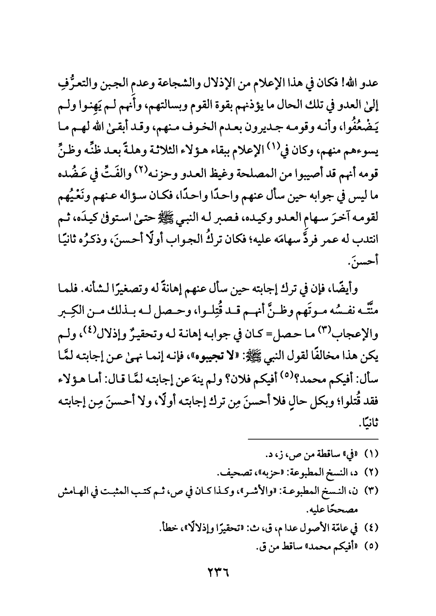 وأيضًا، فإن في ترك إجابته حين سأل عنهم إهانةً له وتصغيرًا لشأنه. فلما منَّتْه نفسُه موتَهم وظنَّ أنهم قد قُتِلوا، وحصل له بذلك من الكِبر والإعجاب (¬٣) ما حصل= كان في جوابه إهانة له وتحقيرٌ وإذلال (¬٤)، ولم يكن هذا مخالفًا لقول النبي - صلى الله عليه وسلم -: «لا تجيبوه»، فإنه إنما نهى عن إجابته لمَّا سأل: أفيكم محمد؟ (¬٥) أفيكم فلان؟ ولم ينهَ عن إجابته لمَّا قال: أما هؤلاء فقد قُتلوا؛ وبكل حالٍ فلا أحسنَ مِن ترك إجابته أولًا، ولا أحسنَ مِن إجابته ثانيًا.
