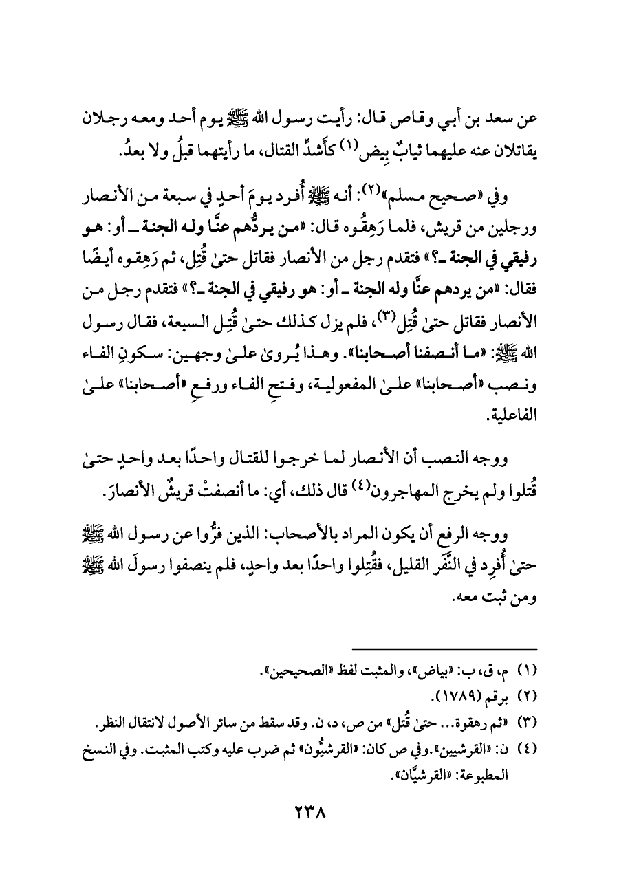 وفي «صحيح مسلم» (¬٢): أنه - صلى الله عليه وسلم - أُفرد يومَ أحدٍ في سبعة من الأنصار ورجلين من قريش، فلما رَهِقُوه قال: «من يردُّهم عنَّا وله الجنة ــ أو: هو رفيقي في الجنة ــ؟» فتقدم رجل من الأنصار فقاتل حتى قُتِل، ثم رَهِقوه أيضًا فقال: «من يردهم عنَّا وله الجنة ــ أو: هو رفيقي في الجنة ــ؟» فتقدم رجل من الأنصار فقاتل حتى قُتِل (¬٣)، فلم يزل كذلك حتى قُتِل السبعة، فقال رسول الله - صلى الله عليه وسلم -: «ما أنصفنا أصحابنا». وهذا يُروى على وجهين: سكونِ الفاء ونصب «أصحابنا» على المفعولية، وفتحِ الفاء ورفعِ «أصحابنا» على الفاعلية.