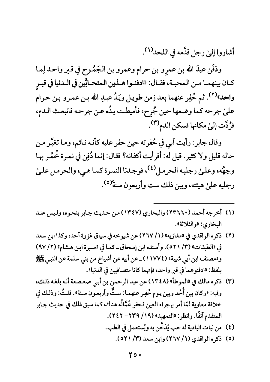 ودَفَن عبدَ الله بن عمرِو بن حرام وعمرو بن الجَمُوح في قبر واحد لِما كان بينهما من المحبة، فقال: «ادفنوا هذين المتحابَّين في الدنيا في قبرٍ واحد» (¬٢). ثم حُفِر عنهما بعد زمن طويل ويَدُ عبدِ الله بن عمرو بن حرام على جرحه كما وضعها حين جُرِح، فأميطت يدُه عن جرحه فانبعث الدم، فرُدَّت إلى مكانها فسكن الدم (¬٣).