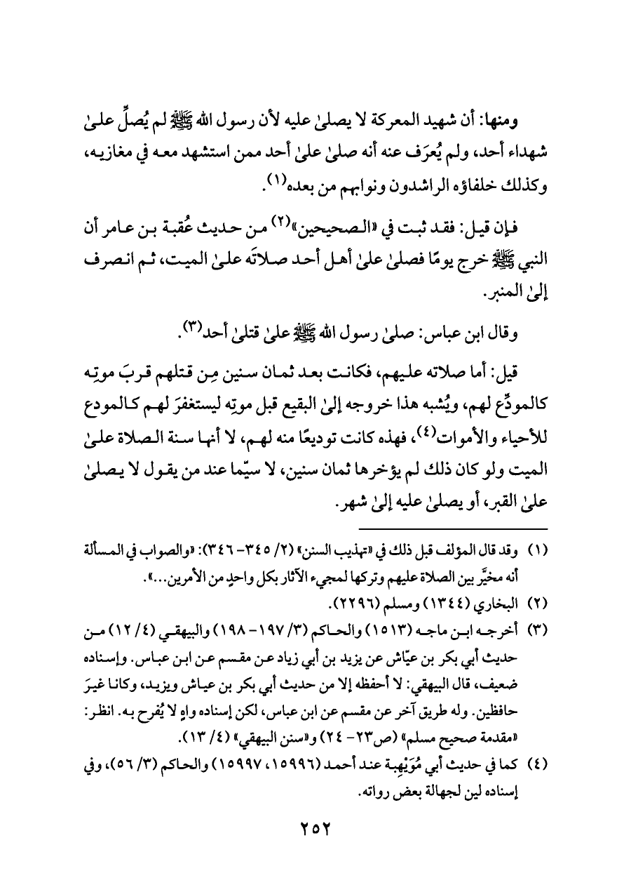 ومنها: أن شهيد المعركة لا يصلى عليه لأن رسول الله - صلى الله عليه وسلم - لم يُصلِّ على شهداء أحد، ولم يُعرَف عنه أنه صلى على أحد ممن استشهد معه في مغازيه، وكذلك خلفاؤه الراشدون ونوابهم من بعده (¬١).