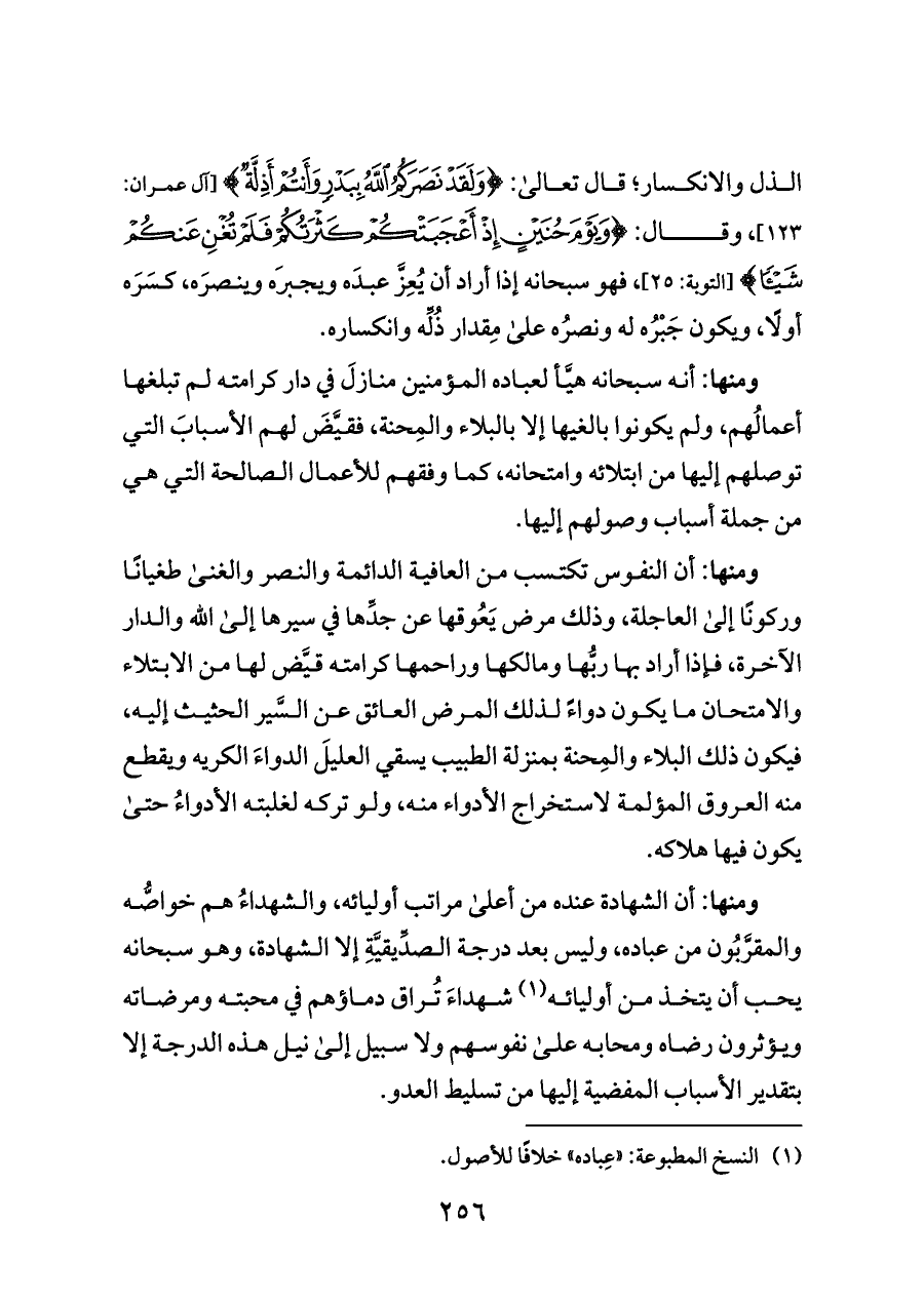 ومنها: أن الشهادة عنده من أعلى مراتب أوليائه، والشهداءُ هم خواصُّه والمقرَّبُون من عباده، وليس بعد درجة الصدِّيقيَّةِ إلا الشهادة، وهو سبحانه يحب أن يتخذ من أوليائه (¬١) شهداءَ تُراق دماؤهم في محبته ومرضاته ويؤثرون رضاه ومحابه على نفوسهم ولا سبيل إلى نيل هذه الدرجة إلا بتقدير الأسباب المفضية إليها من تسليط العدو.
