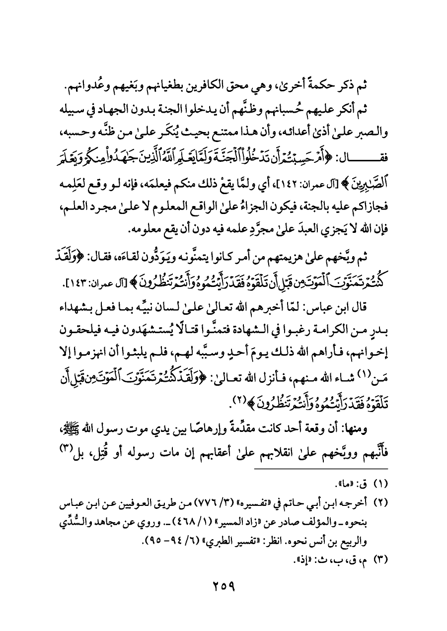 ثم أنكر عليهم حُسبانهم وظنَّهم أن يدخلوا الجنة بدون الجهاد في سبيله والصبر على أذى أعدائه، وأن هذا ممتنع بحيث يُنكَر على من ظنَّه وحسبه، فقال: {أَمْ حَسِبْتُمْ أَنْ تَدْخُلُوا الْجَنَّةَ وَلَمَّا يَعْلَمِ اللَّهُ الَّذِينَ جَاهَدُوا مِنْكُمْ وَيَعْلَمَ الصَّابِرِينَ} [آل عمران: ١٤٢]، أي ولمَّا يقعْ ذلك منكم فيعلمَه، فإنه لو وقع لعَلِمه فجازاكم عليه بالجنة، فيكون الجزاءُ على الواقع المعلوم لا على مجرد العلم، فإن الله لا يَجزي العبدَ على مجرَّدِ علمه فيه دون أن يقع معلومه.