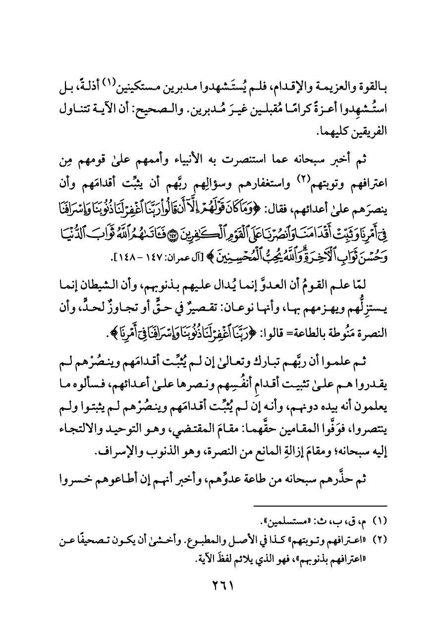 ثم علموا أن ربَّهم تبارك وتعالى إن لم يُثبِّت أقدامَهم وينصُرْهم لم يقدروا هم على تثبيت أقدامِ أنفُسِهم ونصرها على أعدائهم، فسألوه ما يعلمون أنه بيده دونهم، وأنه إن لم يُثبِّت أقدامَهم وينصُرْهم لم يثبتوا ولم ينتصروا، فوَفَّوا المقامين حقَّهما: مقامَ المقتضي، وهو التوحيد والالتجاء إليه سبحانه؛ ومقامَ إزالةِ المانع من النصرة، وهو الذنوب والإسراف.