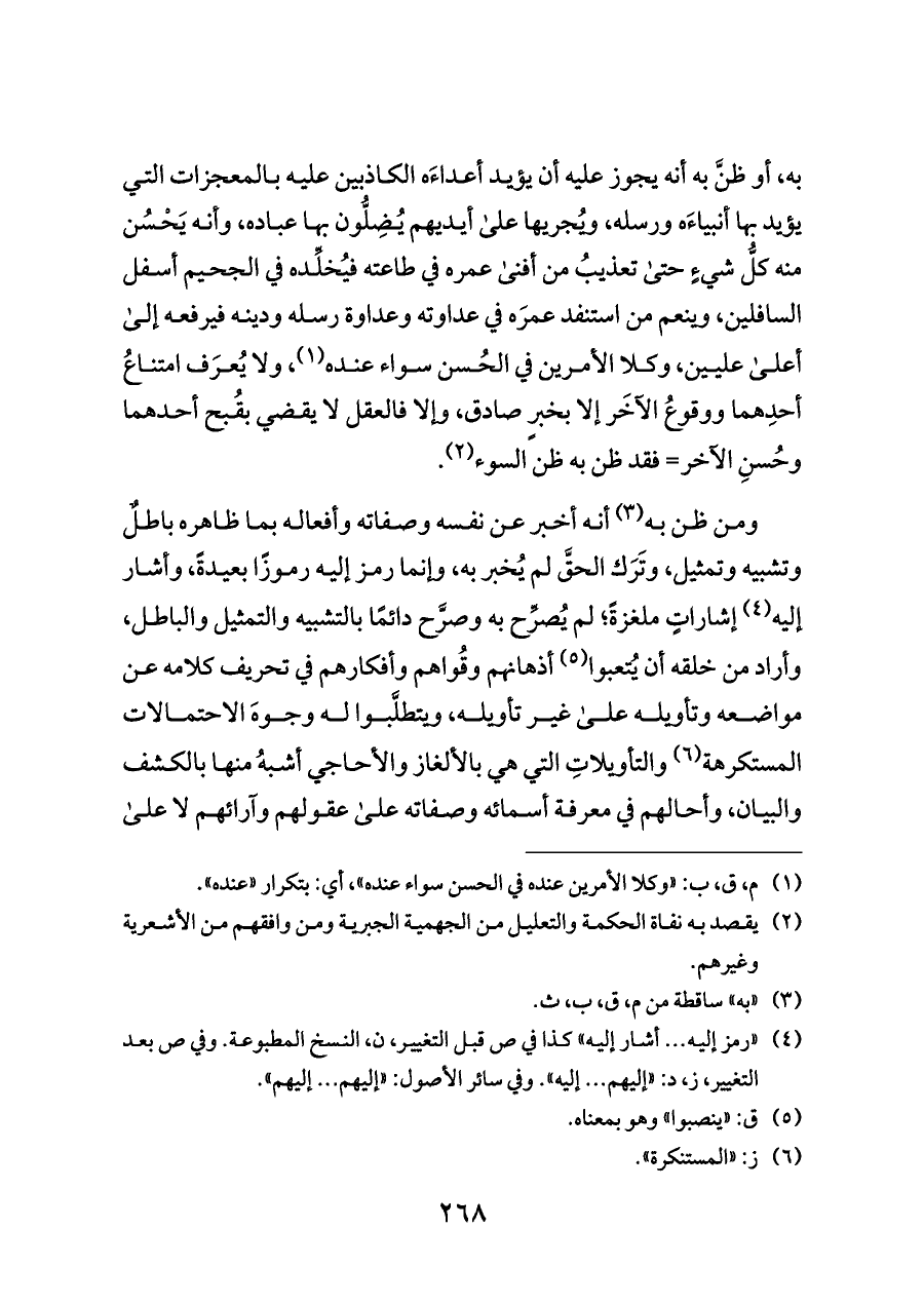 ومن ظن به (¬٣) أنه أخبر عن نفسه وصفاته وأفعاله بما ظاهره باطلٌ وتشبيه وتمثيل، وتَرَك الحقَّ لم يُخبر به، وإنما رمز إليه رموزًا بعيدةً، وأشار إليه (¬٤) إشاراتٍ ملغزةً؛ لم يُصرِّح به وصرَّح دائمًا بالتشبيه والتمثيل والباطل، وأراد من خلقه أن يُتعبوا (¬٥) أذهانهم وقُواهم وأفكارهم في تحريف كلامه عن مواضعه وتأويله على غير تأويله، ويتطلَّبوا له وجوهَ الاحتمالات المستكرهة (¬٦) والتأويلاتِ التي هي بالألغاز والأحاجي أشبهُ منها بالكشف والبيان، وأحالهم في معرفة أسمائه وصفاته على عقولهم وآرائهم لا على