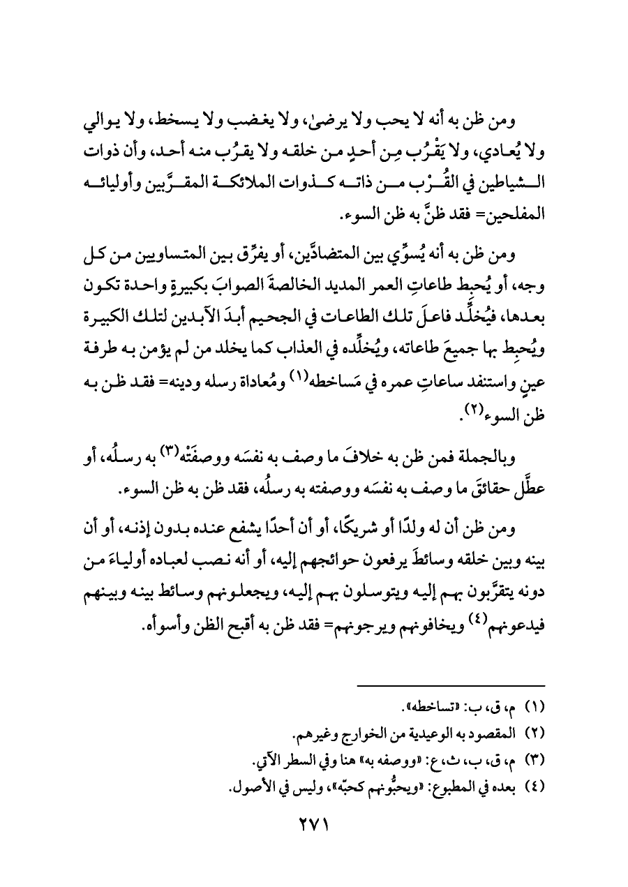 ومن ظن به أنه لا يحب ولا يرضى، ولا يغضب ولا يسخط، ولا يوالي ولا يُعادي، ولا يَقْرُب مِن أحدٍ من خلقه ولا يقرُب منه أحد، وأن ذوات الشياطين في القُرْب من ذاته كذوات الملائكة المقرَّبين وأوليائه المفلحين= فقد ظنَّ به ظن السوء.