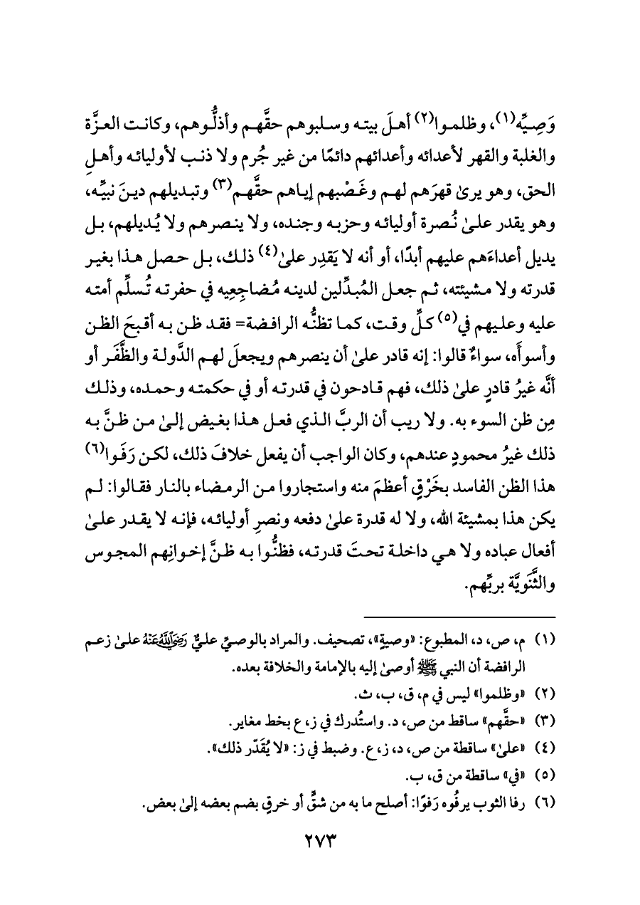 وَصِيِّه (¬١)، وظلموا (¬٢) أهلَ بيته وسلبوهم حقَّهم وأذلُّوهم، وكانت العزَّة والغلبة والقهر لأعدائه وأعدائهم دائمًا من غير جُرم ولا ذنب لأوليائه وأهلِ الحق، وهو يرى قهرَهم لهم وغَصْبهم إياهم حقَّهم (¬٣) وتبديلهم دينَ نبيِّه، وهو يقدر على نُصرة أوليائه وحزبه وجنده، ولا ينصرهم ولا يُديلهم، بل يديل أعداءَهم عليهم أبدًا، أو أنه لا يَقدِر على (¬٤) ذلك، بل حصل هذا بغير قدرته ولا مشيئته، ثم جعل المُبدِّلين لدينه مُضاجِعِيه في حفرته تُسلِّم أمته عليه وعليهم في (¬٥) كلِّ وقت، كما تظنُّه الرافضة= فقد ظن به أقبحَ الظن وأسوأَه، سواءٌ قالوا: إنه قادر على أن ينصرهم ويجعلَ لهم الدَّولة والظَّفَر أو أنَّه غيرُ قادرٍ على ذلك، فهم قادحون في قدرته أو في حكمته وحمده، وذلك مِن ظن السوء به. ولا ريب أن الربَّ الذي فعل هذا بغيض إلى من ظنَّ به ذلك غيرُ محمودٍ عندهم، وكان الواجب أن يفعل خلافَ ذلك، لكن رَفَوا (¬٦)