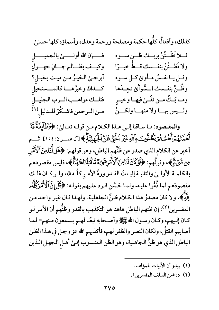والمقصود: ما ساقنا إلى هذا الكلام من قوله تعالى: {وَطَائِفَةٌ قَدْ أَهَمَّتْهُمْ أَنْفُسُهُمْ يَظُنُّونَ بِاللَّهِ غَيْرَ الْحَقِّ ظَنَّ الْجَاهِلِيَّةِ} [آل عمران: ١٥٤]. ثم أخبر عن الكلام الذي صدر عن ظَنِّهم الباطل، وهو قولهم: {هَلْ لَنَا مِنَ الْأَمْرِ مِنْ شَيْءٍ}، وقولُهم: {لَوْ كَانَ لَنَا مِنَ الْأَمْرِ شَيْءٌ مَا قُتِلْنَا هَاهُنَا}، فليس مقصودهم بالكلمة الأولى والثانية إثباتَ القدر وردَّ الأمرِ كلِّه لله، ولو كان ذلك مقصودَهم لما ذُمُّوا عليه، ولما حَسُن الرد عليهم بقوله: {قُلْ إِنَّ الْأَمْرَ كُلَّهُ لِلَّهِ}، ولا كان مصدرُ هذا الكلام ظنَّ الجاهلية. ولهذا قال غير واحد من المفسرين (¬٢): إن ظنهم الباطل هاهنا هو التكذيب بالقدر وظنُّهم أن الأمر لو كان إليهم، وكان رسول الله - صلى الله عليه وسلم - وأصحابه تبعًا لهم يسمعون منهم= لما أصابهم القتلُ، ولكان النصر والظفر لهم، فأكذبهم الله عز وجل في هذا الظن الباطل الذي هو ظنُّ الجاهلية، وهو الظن المنسوب إلى أهلِ الجهل الذين