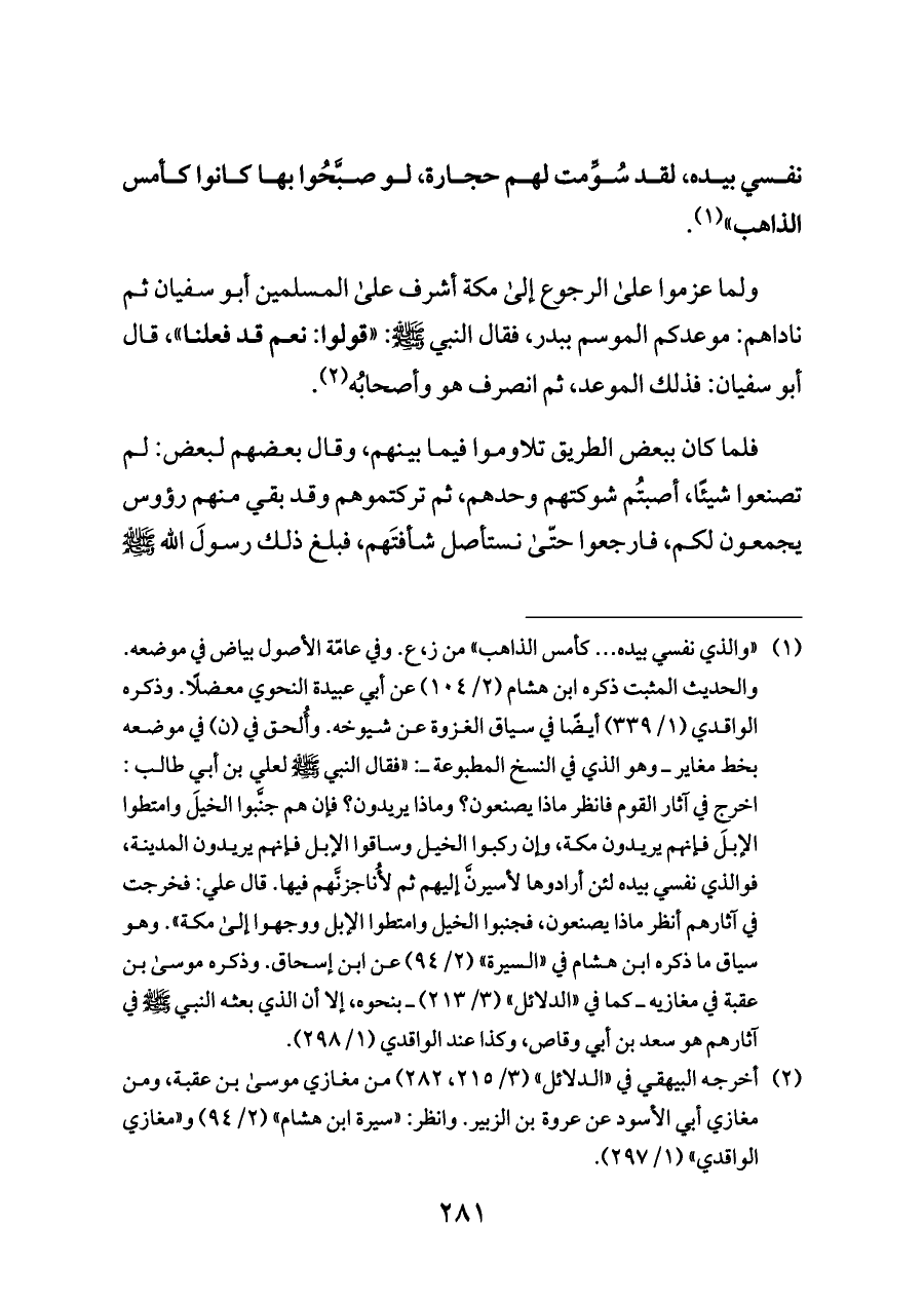(¬١) «والذي نفسي بيده ... كأمس الذاهب» من ز، ع. وفي عامّة الأصول بياض في موضعه. والحديث المثبت ذكره ابن هشام (٢/ ١٠٤) عن أبي عبيدة النحوي معضلًا. وذكره الواقدي (١/ ٣٣٩) أيضًا في سياق الغزوة عن شيوخه. وأُلحق في (ن) في موضعه بخط مغاير ــ وهو الذي في النسخ المطبوعة ــ: «فقال النبي - صلى الله عليه وسلم - لعلي بن أبي طالب: اخرج في آثار القوم فانظر ماذا يصنعون؟ وماذا يريدون؟ فإن هم جنَّبوا الخيلَ وامتطوا الإبلَ فإنهم يريدون مكة، وإن ركبوا الخيل وساقوا الإبل فإنهم يريدون المدينة، فوالذي نفسي بيده لئن أرادوها لأسيرنَّ إليهم ثم لأُناجزنَّهم فيها. قال علي: فخرجت في آثارهم أنظر ماذا يصنعون، فجنبوا الخيل وامتطوا الإبل ووجهوا إلى مكة». وهو سياق ما ذكره ابن هشام في «السيرة» (٢/ ٩٤) عن ابن إسحاق. وذكره موسى بن عقبة في مغازيه ــ كما في «الدلائل» (٣/ ٢١٣) ــ بنحوه، إلا أن الذي بعثه النبي - صلى الله عليه وسلم - في آثارهم هو سعد بن أبي وقاص، وكذا عند الواقدي (١/ ٢٩٨).