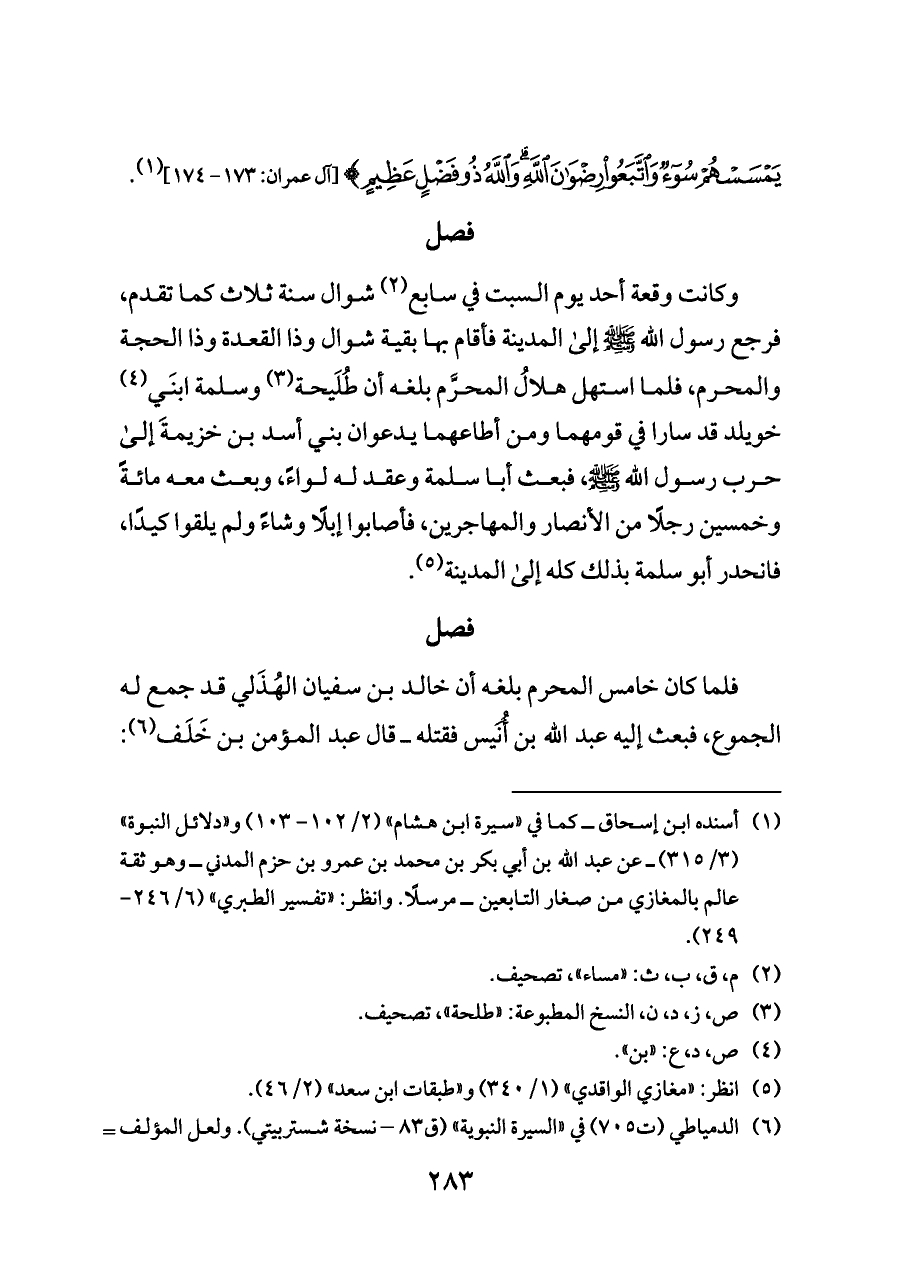 وكانت وقعة أحد يوم السبت في سابع (¬٢) شوال سنة ثلاث كما تقدم، فرجع رسول الله - صلى الله عليه وسلم - إلى المدينة فأقام بها بقية شوال وذا القعدة وذا الحجة والمحرم، فلما استهل هلالُ المحرَّم بلغه أن طُلَيحة (¬٣) وسلمة ابنَي (¬٤) خويلد قد سارا في قومهما ومن أطاعهما يدعوان بني أسد بن خزيمةَ إلى حرب رسول الله - صلى الله عليه وسلم -، فبعث أبا سلمة وعقد له لواءً، وبعث معه مائةً وخمسين رجلًا من الأنصار والمهاجرين، فأصابوا إبلًا وشاءً ولم يلقوا كيدًا، فانحدر أبو سلمة بذلك كله إلى المدينة (¬٥).