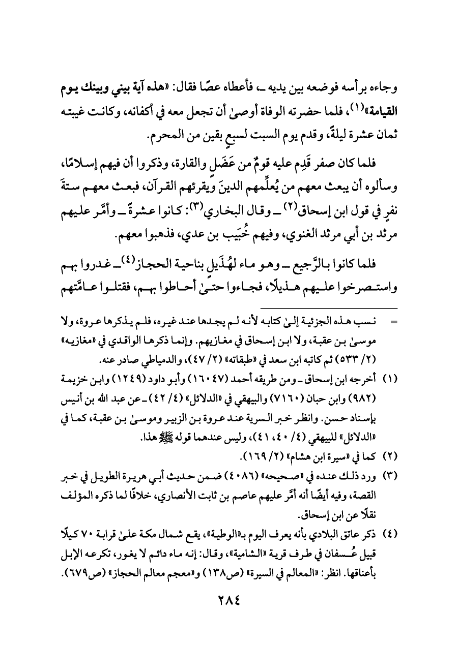 (¬٣) ورد ذلك عنده في «صحيحه» (٤٠٨٦) ضمن حديث أبي هريرة الطويل في خبر القصة، وفيه أيضًا أنه أمَّر عليهم عاصم بن ثابت الأنصاري، خلافًا لما ذكره المؤلف نقلًا عن ابن إسحاق.