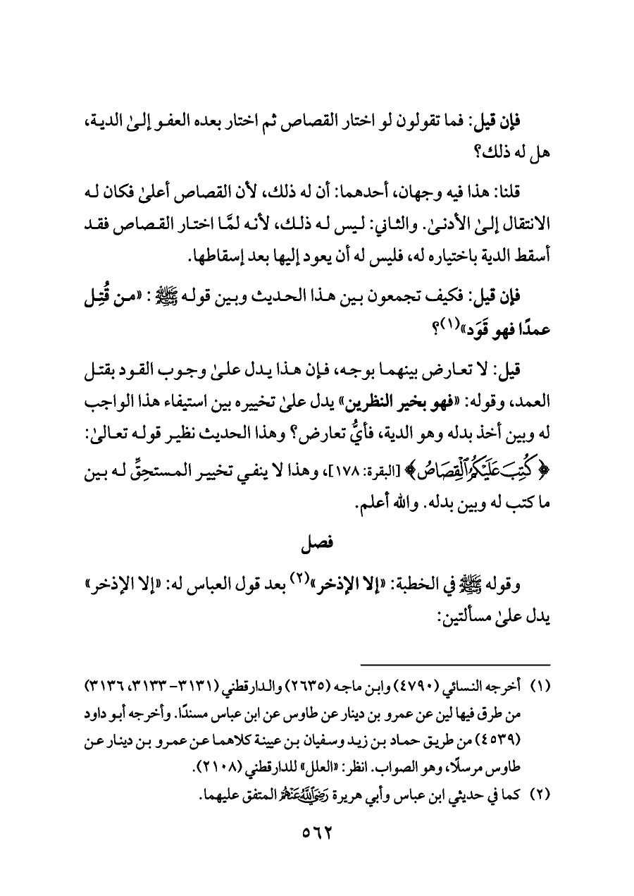 وقوله - صلى الله عليه وسلم - في الخطبة: «إلا الإذخر» (¬٢) بعد قول العباس له: «إلا الإذخر» يدل على مسألتين: