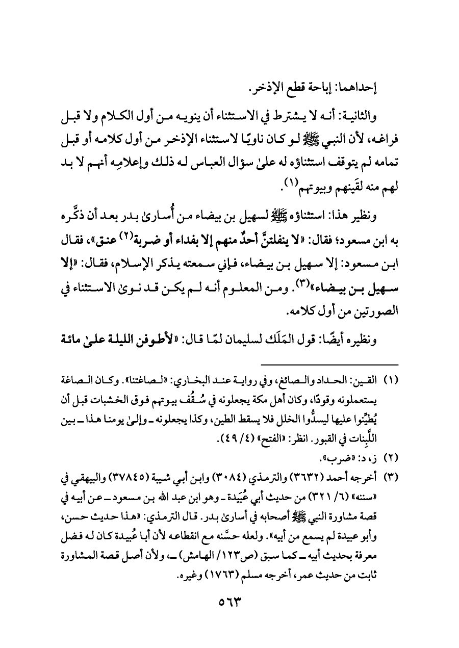 ونظير هذا: استثناؤه - صلى الله عليه وسلم - لسهيل بن بيضاء من أُسارى بدر بعد أن ذكَّره به ابن مسعود؛ فقال: «لا ينفلتنَّ أحدٌ منهم إلا بفداء أو ضربة (¬٢) عنق»، فقال ابن مسعود: إلا سهيل بن بيضاء، فإني سمعته يذكر الإسلام، فقال: «إلا سهيل بن بيضاء» (¬٣). ومن المعلوم أنه لم يكن قد نوى الاستثناء في الصورتين من أول كلامه.