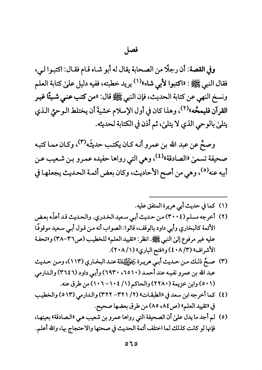 (¬٥) لم أجد ما يدل على أن الصحيفة التي رواها عمرو بن شعيب هي «الصادقة» بعينها، فإنها لو كانت كذلك لما اختلف أئمة الحديث في صحتها والاحتجاج بها، والله أعلم.