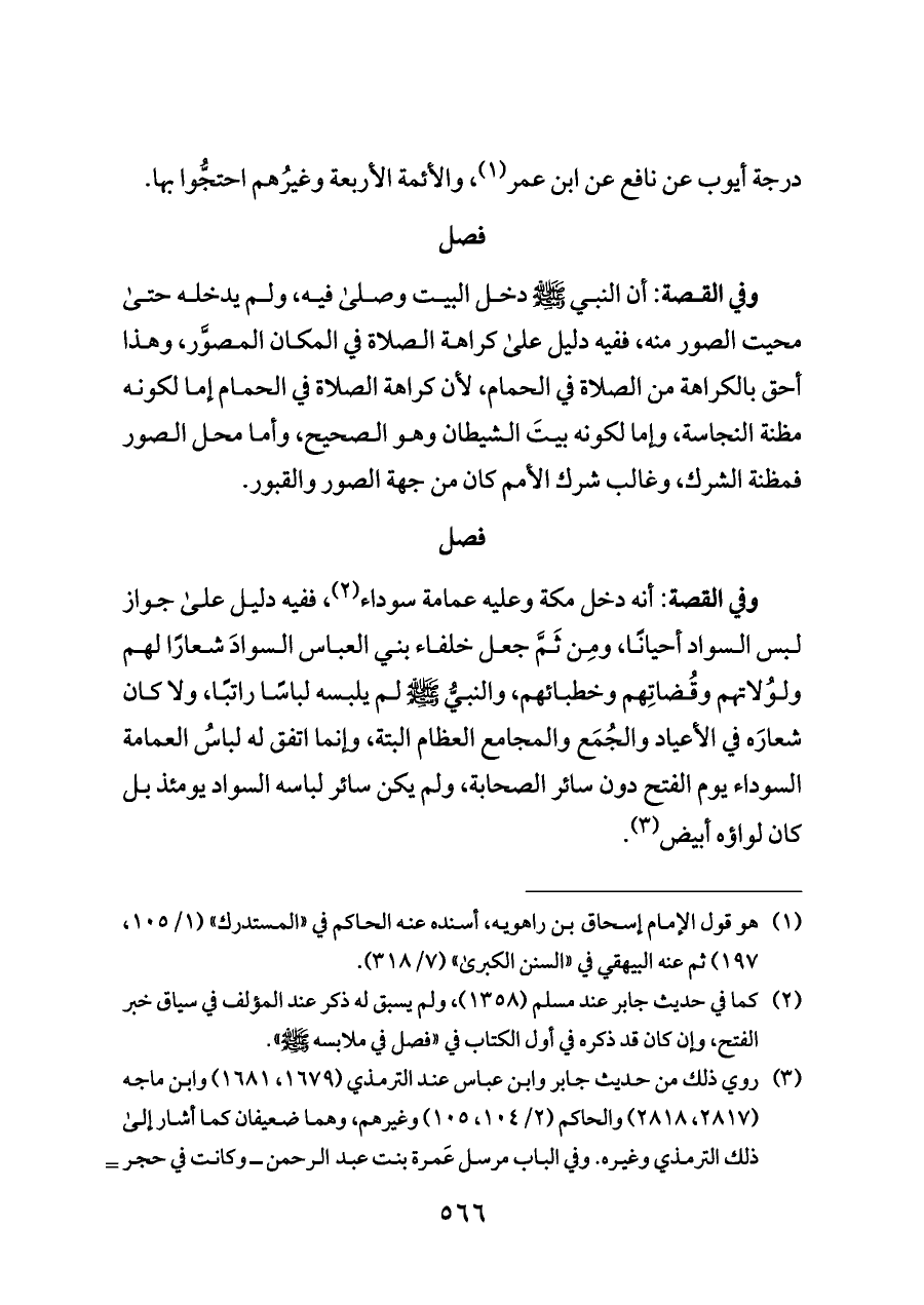 وفي القصة: أنه دخل مكة وعليه عمامة سوداء (¬٢)، ففيه دليل على جواز لبس السواد أحيانًا، ومِن ثَمَّ جعل خلفاء بني العباس السوادَ شعارًا لهم ولوُلاتهم وقُضاتِهم وخطبائهم، والنبيُّ - صلى الله عليه وسلم - لم يلبسه لباسًا راتبًا، ولا كان شعارَه في الأعياد والجُمَع والمجامع العظام البتة، وإنما اتفق له لباسُ العمامة السوداء يوم الفتح دون سائر الصحابة، ولم يكن سائر لباسه السواد يومئذ بل كان لواؤه أبيض (¬٣).