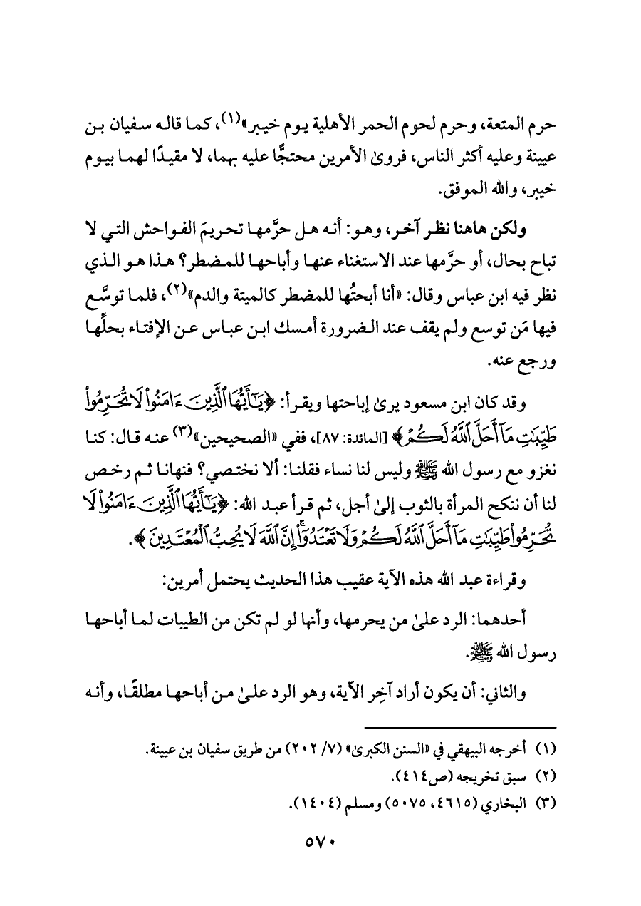 ولكن هاهنا نظر آخر، وهو: أنه هل حرَّمها تحريمَ الفواحش التي لا تباح بحال، أو حرَّمها عند الاستغناء عنها وأباحها للمضطر؟ هذا هو الذي نظر فيه ابن عباس وقال: «أنا أبحتُها للمضطر كالميتة والدم» (¬٢)، فلما توسَّع فيها مَن توسع ولم يقف عند الضرورة أمسك ابن عباس عن الإفتاء بحلِّها ورجع عنه.
