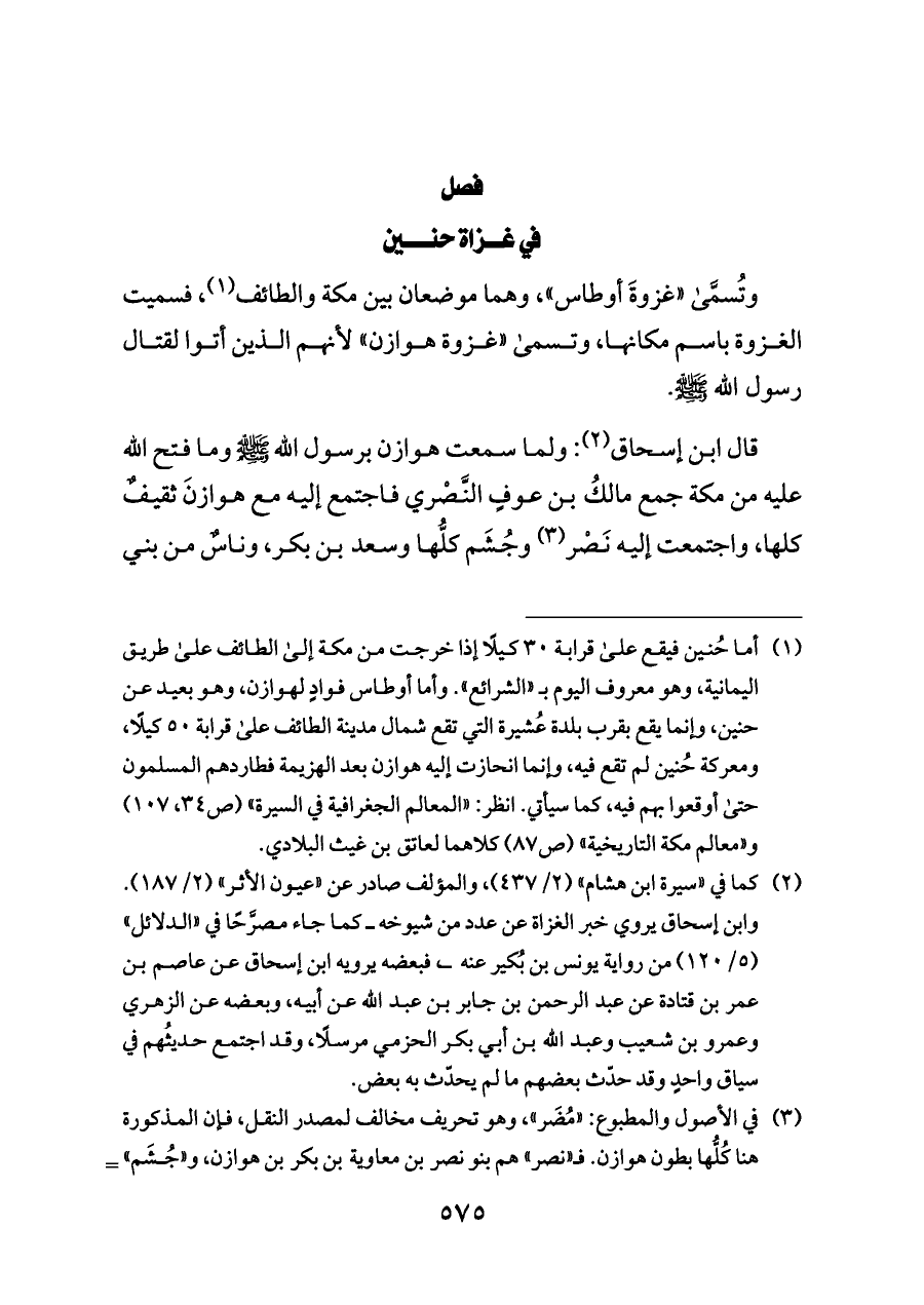 (¬١) أما حُنين فيقع على قرابة ٣٠ كيلًا إذا خرجت من مكة إلى الطائف على طريق اليمانية، وهو معروف اليوم بـ «الشرائع». وأما أوطاس فوادٍ لهوازن، وهو بعيد عن حنين، وإنما يقع بقرب بلدة عُشيرة التي تقع شمال مدينة الطائف على قرابة ٥٠ كيلًا، ومعركة حُنين لم تقع فيه، وإنما انحازت إليه هوازن بعد الهزيمة فطاردهم المسلمون حتى أوقعوا بهم فيه، كما سيأتي. انظر: «المعالم الجغرافية في السيرة» (ص ٣٤، ١٠٧) و «معالم مكة التاريخية» (ص ٨٧) كلاهما لعاتق بن غيث البلادي.