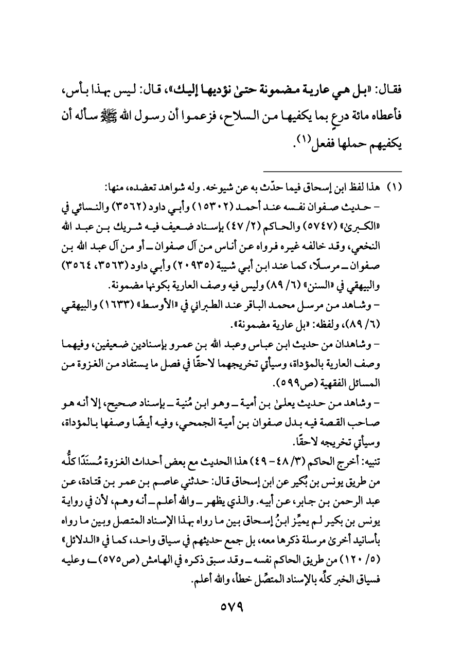 - حديث صفوان نفسه عند أحمد (١٥٣٠٢) وأبي داود (٣٥٦٢) والنسائي في «الكبرى» (٥٧٤٧) والحاكم (٢/ ٤٧) بإسناد ضعيف فيه شريك بن عبد الله النخعي، وقد خالفه غيره فرواه عن أناس من آل صفوان ــ أو من آل عبد الله بن صفوان ــ مرسلًا، كما عند ابن أبي شيبة (٢٠٩٣٥) وأبي داود (٣٥٦٣، ٣٥٦٤) والبيهقي في «السنن» (٦/ ٨٩) وليس فيه وصف العارية بكونها مضمونة.