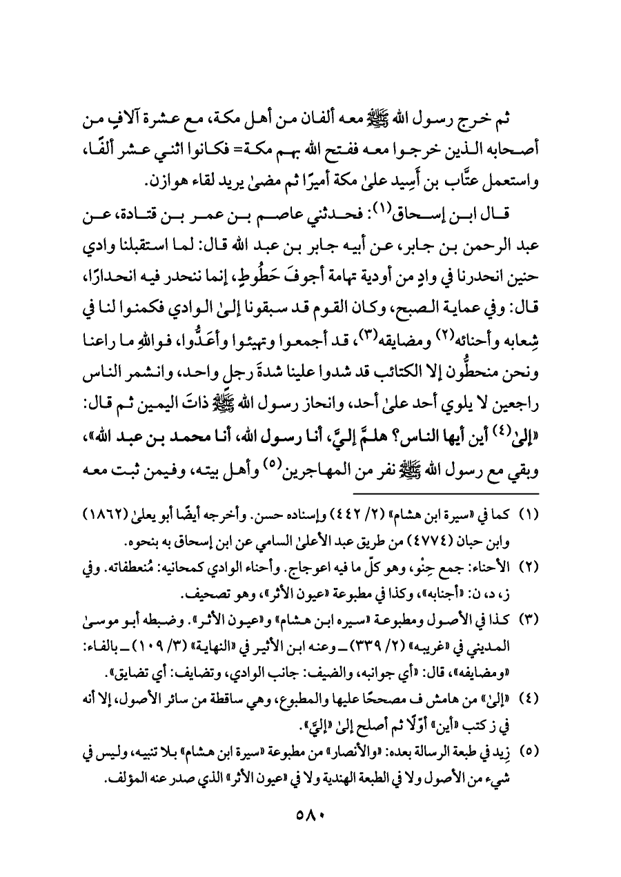 (¬٥) زِيد في طبعة الرسالة بعده: «والأنصار» من مطبوعة «سيرة ابن هشام» بلا تنبيه، وليس في شيء من الأصول ولا في الطبعة الهندية ولا في «عيون الأثر» الذي صدر عنه المؤلف.
