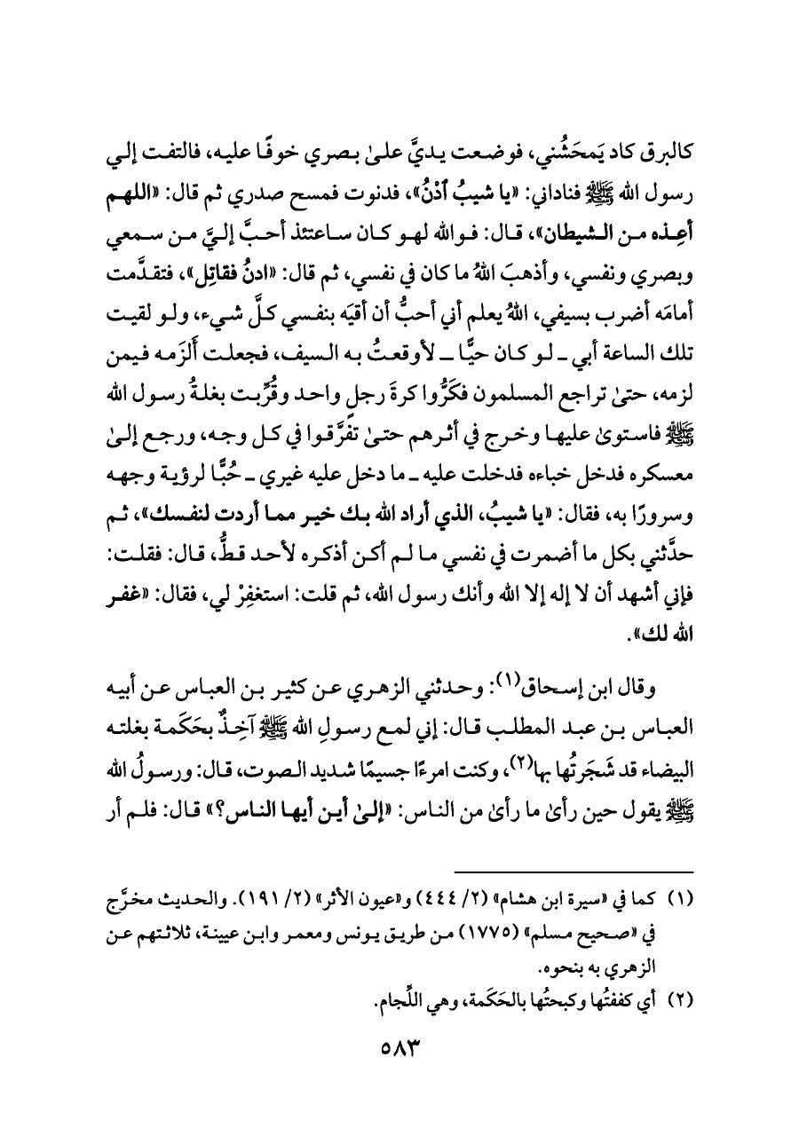 كالبرق كاد يَمحَشُني، فوضعت يديَّ على بصري خوفًا عليه، فالتفت إلي رسول الله - صلى الله عليه وسلم - فناداني: «يا شيبُ ادْنُ»، فدنوت فمسح صدري ثم قال: «اللهم أعِذه من الشيطان»، قال: فوالله لهو كان ساعتئذ أحبَّ إليَّ من سمعي وبصري ونفسي، وأذهبَ اللهُ ما كان في نفسي، ثم قال: «ادنُ فقاتِل»، فتقدَّمت أمامَه أضرب بسيفي، اللهُ يعلم أني أحبُّ أن أقيَه بنفسي كلَّ شيء، ولو لقيت تلك الساعة أبي ــ لو كان حيًّا ــ لأوقعتُ به السيف، فجعلت أَلزَمه فيمن لزمه، حتى تراجع المسلمون فكَرُّوا كرةَ رجلٍ واحد وقُرِّبت بغلةُ رسول الله - صلى الله عليه وسلم - فاستوى عليها وخرج في أثرهم حتى تفرَّقوا في كل وجه، ورجع إلى معسكره فدخل خباءه فدخلت عليه ــ ما دخل عليه غيري ــ حُبًّا لرؤية وجهه وسرورًا به، فقال: «يا شيبُ، الذي أراد الله بك خير مما أردت لنفسك»، ثم حدَّثني بكل ما أضمرت في نفسي ما لم أكن أذكره لأحد قطُّ، قال: فقلت: فإني أشهد أن لا إله إلا الله وأنك رسول الله، ثم قلت: استغفِرْ لي، فقال: «غفر الله لك».