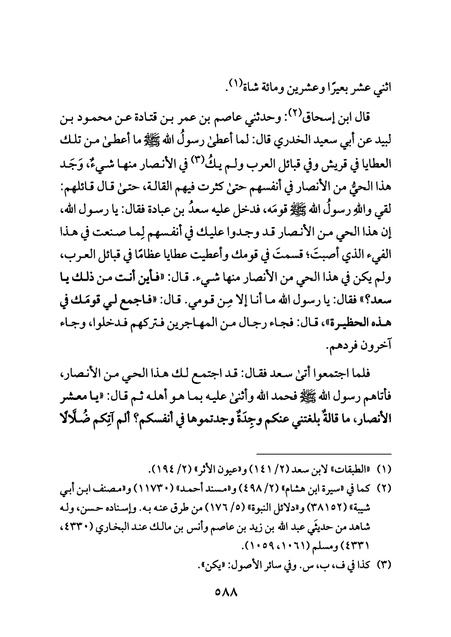 قال ابن إسحاق (¬٢): وحدثني عاصم بن عمر بن قتادة عن محمود بن لبيد عن أبي سعيد الخدري قال: لما أعطى رسولُ الله - صلى الله عليه وسلم - ما أعطى من تلك العطايا في قريش وفي قبائل العرب ولم يكُ (¬٣) في الأنصار منها شيءٌ، وَجَد هذا الحيُّ من الأنصار في أنفسهم حتى كثرت فيهم القالة، حتى قال قائلهم: لقي واللهِ رسولُ الله - صلى الله عليه وسلم - قومَه، فدخل عليه سعدُ بن عبادة فقال: يا رسول الله، إن هذا الحي من الأنصار قد وجدوا عليك في أنفسهم لِما صنعت في هذا الفيء الذي أصبتَ؛ قسمتَ في قومك وأعطيت عطايا عظامًا في قبائل العرب، ولم يكن في هذا الحي من الأنصار منها شيء. قال: «فأين أنت من ذلك يا سعد؟» فقال: يا رسول الله ما أنا إلا مِن قومي. قال: «فاجمع لي قومَك في هذه الحظيرة»، قال: فجاء رجال من المهاجرين فتركهم فدخلوا، وجاء آخرون فردهم.