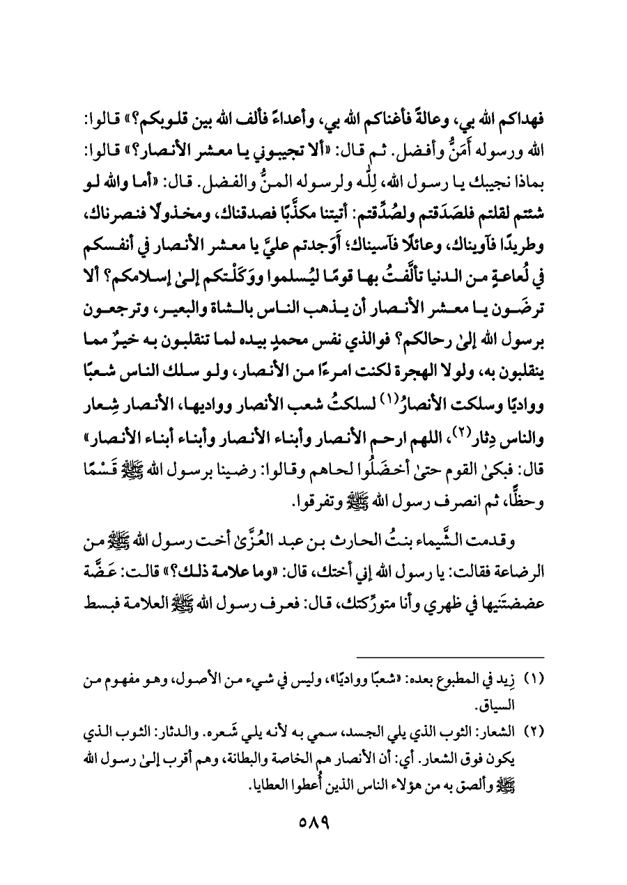 (¬٢) الشعار: الثوب الذي يلي الجسد، سمي به لأنه يلي شَعره. والدثار: الثوب الذي يكون فوق الشعار. أي: أن الأنصار هم الخاصة والبطانة، وهم أقرب إلى رسول الله - صلى الله عليه وسلم - وألصق به من هؤلاء الناس الذين أُعطوا العطايا.