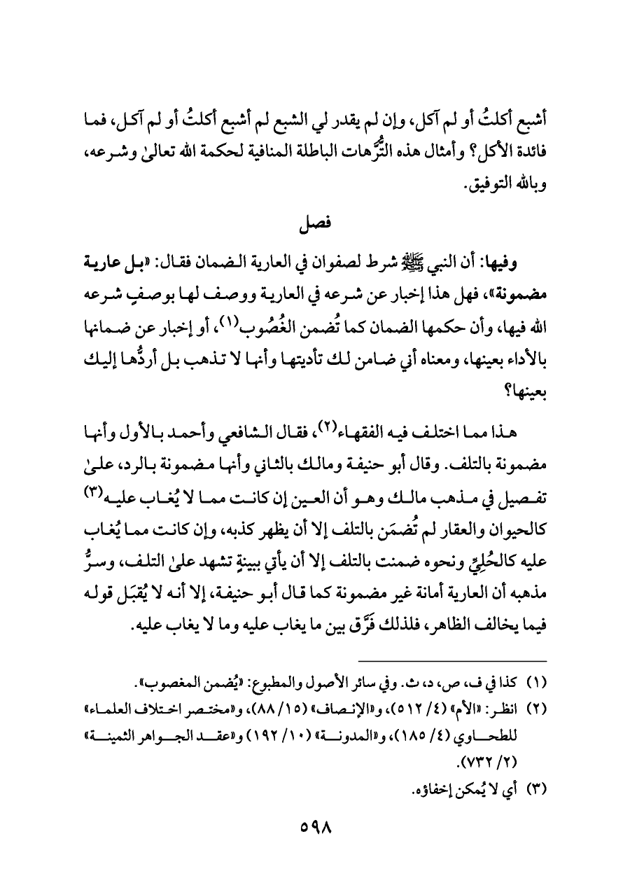 هذا مما اختلف فيه الفقهاء (¬٢)، فقال الشافعي وأحمد بالأول وأنها مضمونة بالتلف. وقال أبو حنيفة ومالك بالثاني وأنها مضمونة بالرد، على تفصيل في مذهب مالك وهو أن العين إن كانت مما لا يُغاب عليه (¬٣) كالحيوان والعقار لم تُضمَن بالتلف إلا أن يظهر كذبه، وإن كانت مما يُغاب عليه كالحُلِيِّ ونحوه ضمنت بالتلف إلا أن يأتي ببينةٍ تشهد على التلف، وسرُّ مذهبه أن العارية أمانة غير مضمونة كما قال أبو حنيفة، إلا أنه لا يُقبَل قوله فيما يخالف الظاهر، فلذلك فَرَّق بين ما يغاب عليه وما لا يغاب عليه.