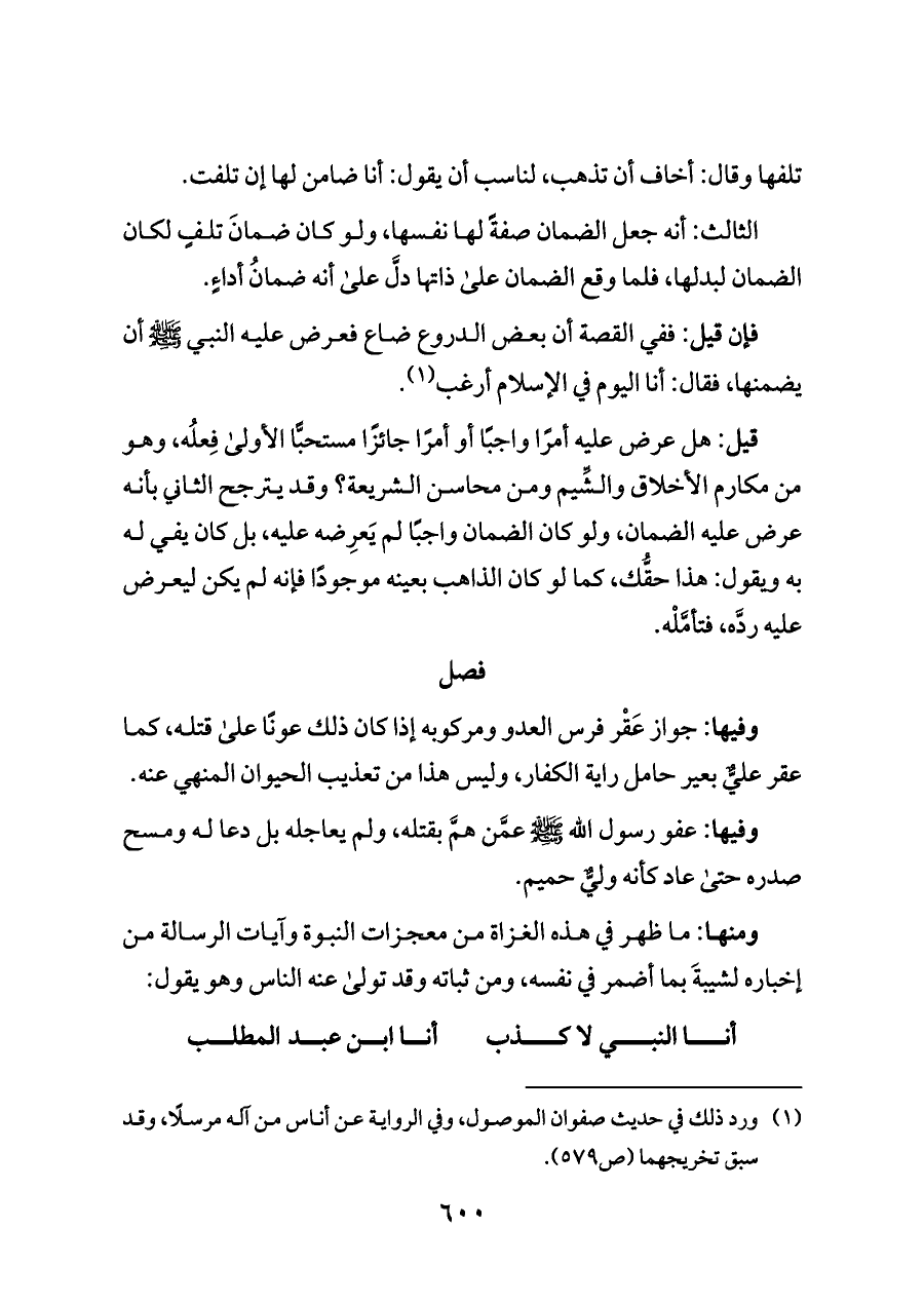 قيل: هل عرض عليه أمرًا واجبًا أو أمرًا جائزًا مستحبًّا الأولى فِعلُه، وهو من مكارم الأخلاق والشِّيم ومن محاسن الشريعة؟ وقد يترجح الثاني بأنه عرض عليه الضمان، ولو كان الضمان واجبًا لم يَعرِضه عليه، بل كان يفي له به ويقول: هذا حقُّك، كما لو كان الذاهب بعينه موجودًا فإنه لم يكن ليعرض عليه ردَّه، فتأمَّلْه.