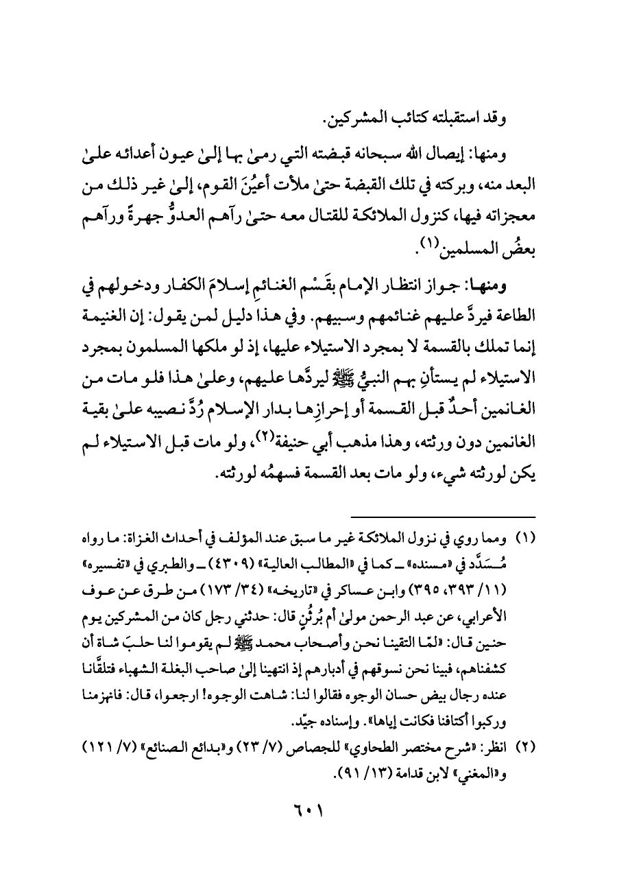 (¬١) ومما روي في نزول الملائكة غير ما سبق عند المؤلف في أحداث الغزاة: ما رواه مُسَدَّد في «مسنده» ــ كما في «المطالب العالية» (٤٣٠٩) ــ والطبري في «تفسيره» (١١/ ٣٩٣، ٣٩٥) وابن عساكر في «تاريخه» (٣٤/ ١٧٣) من طرق عن عوف الأعرابي، عن عبد الرحمن مولى أم بُرثُنٍ قال: حدثني رجل كان من المشركين يوم حنين قال: «لمّا التقينا نحن وأصحاب محمد - صلى الله عليه وسلم - لم يقوموا لنا حلبَ شاة أن كشفناهم، فبينا نحن نسوقهم في أدبارهم إذ انتهينا إلى صاحب البغلة الشهباء فتلقَّانا عنده رجال بيض حسان الوجوه فقالوا لنا: شاهت الوجوه! ارجعوا، قال: فانهزمنا وركبوا أكتافنا فكانت إياها». وإسناده جيّد.