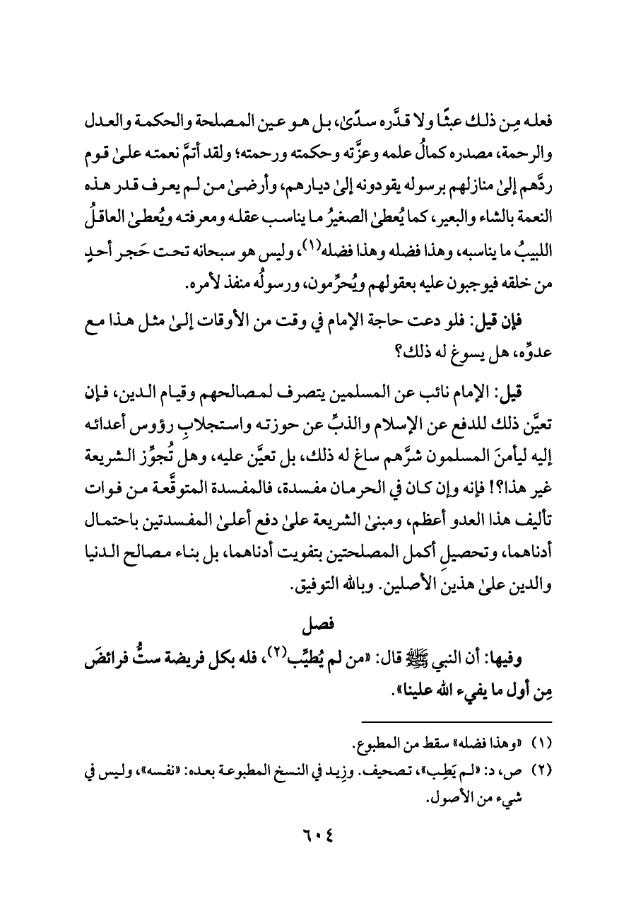 فعله مِن ذلك عبثًا ولا قدَّره سدًى، بل هو عين المصلحة والحكمة والعدل والرحمة، مصدره كمالُ علمه وعزَّته وحكمته ورحمته؛ ولقد أتمَّ نعمته على قوم ردَّهم إلى منازلهم برسوله يقودونه إلى ديارهم، وأرضى من لم يعرف قدر هذه النعمة بالشاء والبعير، كما يُعطى الصغيرُ ما يناسب عقله ومعرفته ويُعطى العاقلُ اللبيبُ ما يناسبه، وهذا فضله وهذا فضله (¬١)، وليس هو سبحانه تحت حَجر أحدٍ من خلقه فيوجبون عليه بعقولهم ويُحرِّمون، ورسولُه منفذ لأمره.