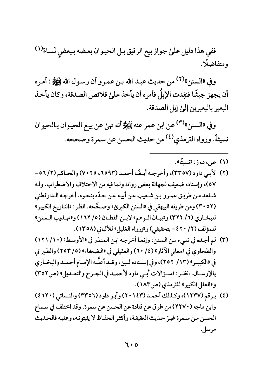 وفي «السنن» (¬٣) عن ابن عمر عنه - صلى الله عليه وسلم - أنه نهى عن بيع الحيوان بالحيوان نسيئةً. ورواه الترمذي (¬٤) من حديث الحسن عن سمرة وصححه.