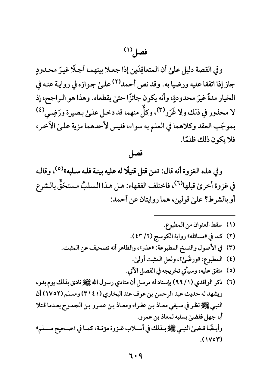 (¬٦) ذكر الواقدي (١/ ٩٩) بإسناد له مرسل أن منادي رسول الله - صلى الله عليه وسلم - نادى بذلك يوم بدر، ويشهد له حديث عبد الرحمن بن عوف عند البخاري (٣١٤١) ومسلم (١٧٥٢) أن النبي - صلى الله عليه وسلم - نظر في سيفي معاذ بن عفراء ومعاذ بن عمرو بن الجموح بعدما قتلا أبا جهل فقضى بسلبه لمعاذ بن عمرو.