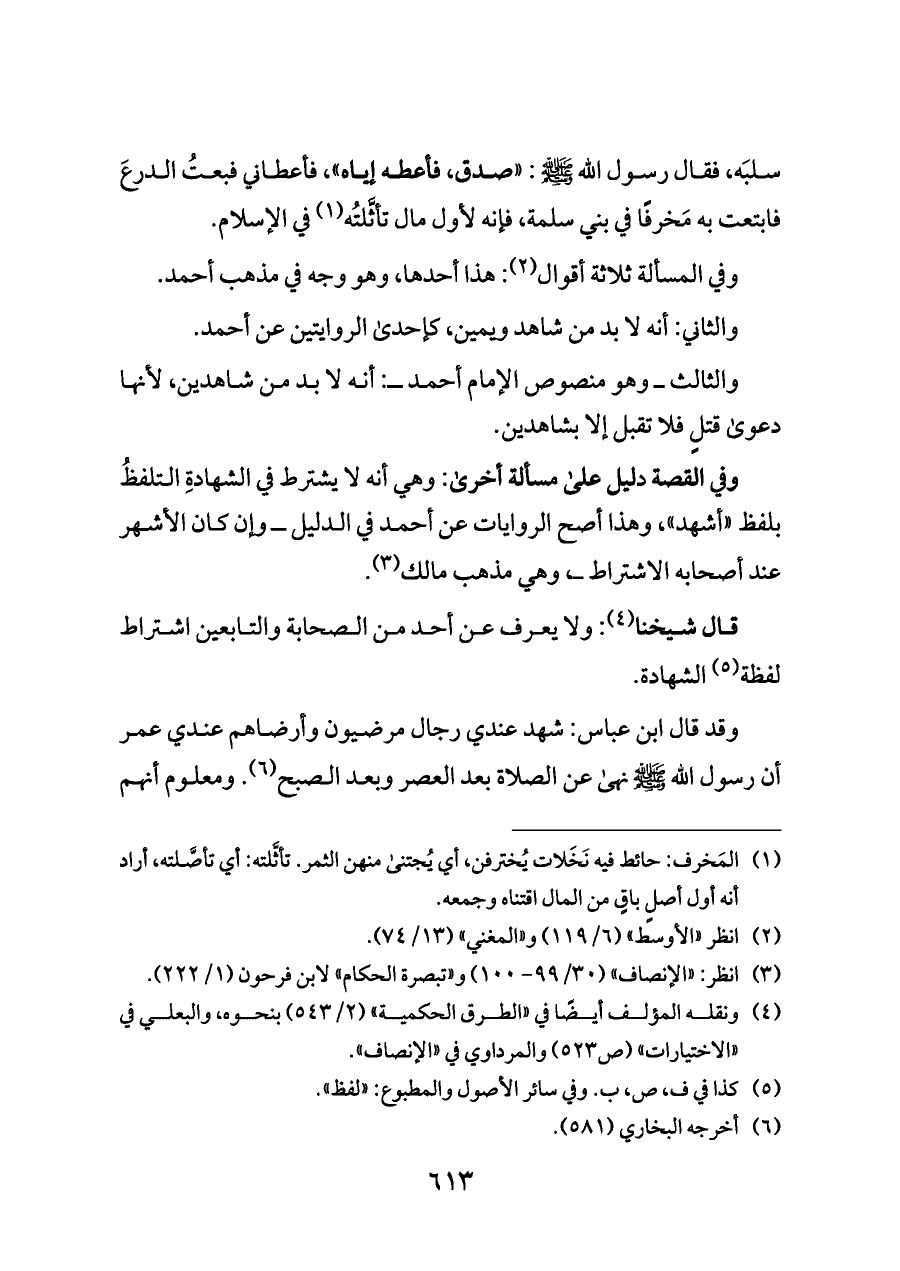 وفي القصة دليل على مسألة أخرى: وهي أنه لا يشترط في الشهادةِ التلفظُ بلفظ «أشهد»، وهذا أصح الروايات عن أحمد في الدليل ــ وإن كان الأشهر عند أصحابه الاشتراط ــ، وهي مذهب مالك (¬٣).