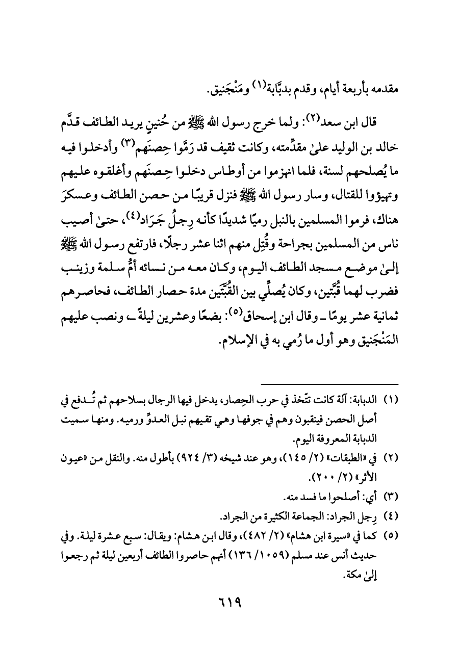 قال ابن سعد (¬٢): ولما خرج رسول الله - صلى الله عليه وسلم - من حُنينٍ يريد الطائف قدَّم خالد بن الوليد على مقدِّمته، وكانت ثقيف قد رَمَّوا حِصنَهم (¬٣) وأدخلوا فيه ما يُصلحهم لسنة، فلما انهزموا من أوطاس دخلوا حِصنَهم وأغلقوه عليهم وتهيؤوا للقتال، وسار رسول الله - صلى الله عليه وسلم - فنزل قريبًا من حصن الطائف وعسكرَ هناك، فرموا المسلمين بالنبل رميًا شديدًا كأنه رِجلُ جَرَاد (¬٤)، حتى أصيب ناس من المسلمين بجراحة وقُتِل منهم اثنا عشر رجلًا، فارتفع رسول الله - صلى الله عليه وسلم - إلى موضع مسجد الطائف اليوم، وكان معه من نسائه أمُّ سلمة وزينب فضرب لهما قُبَّتين، وكان يُصلِّي بين القُبَّتَين مدة حصار الطائف، فحاصرهم ثمانية عشر يومًا ــ وقال ابن إسحاق (¬٥): بضعًا وعشرين ليلةً ــ، ونصب عليهم المَنْجَنيق وهو أول ما رُمي به في الإسلام.
