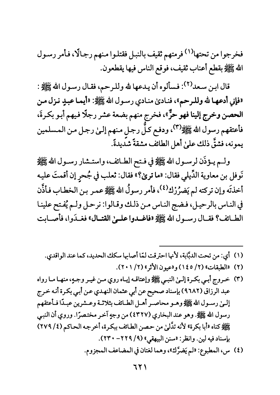 قال ابن سعد (¬٢): فسألوه أن يدعها لله وللرحم، فقال رسول الله - صلى الله عليه وسلم -: «فإني أدعها لله وللرحم»، فنادى منادي رسول الله - صلى الله عليه وسلم -: «أيما عبدٍ نزل من الحصن وخرج إلينا فهو حرٌّ»، فخرج منهم بضعة عشر رجلًا فيهم أبو بكرةَ، فأعتقهم رسول الله - صلى الله عليه وسلم - (¬٣)، ودفع كلُّ رجلٍ منهم إلى رجل من المسلمين يمونه، فشقَّ ذلك على أهل الطائف مشقةً شديدةً.