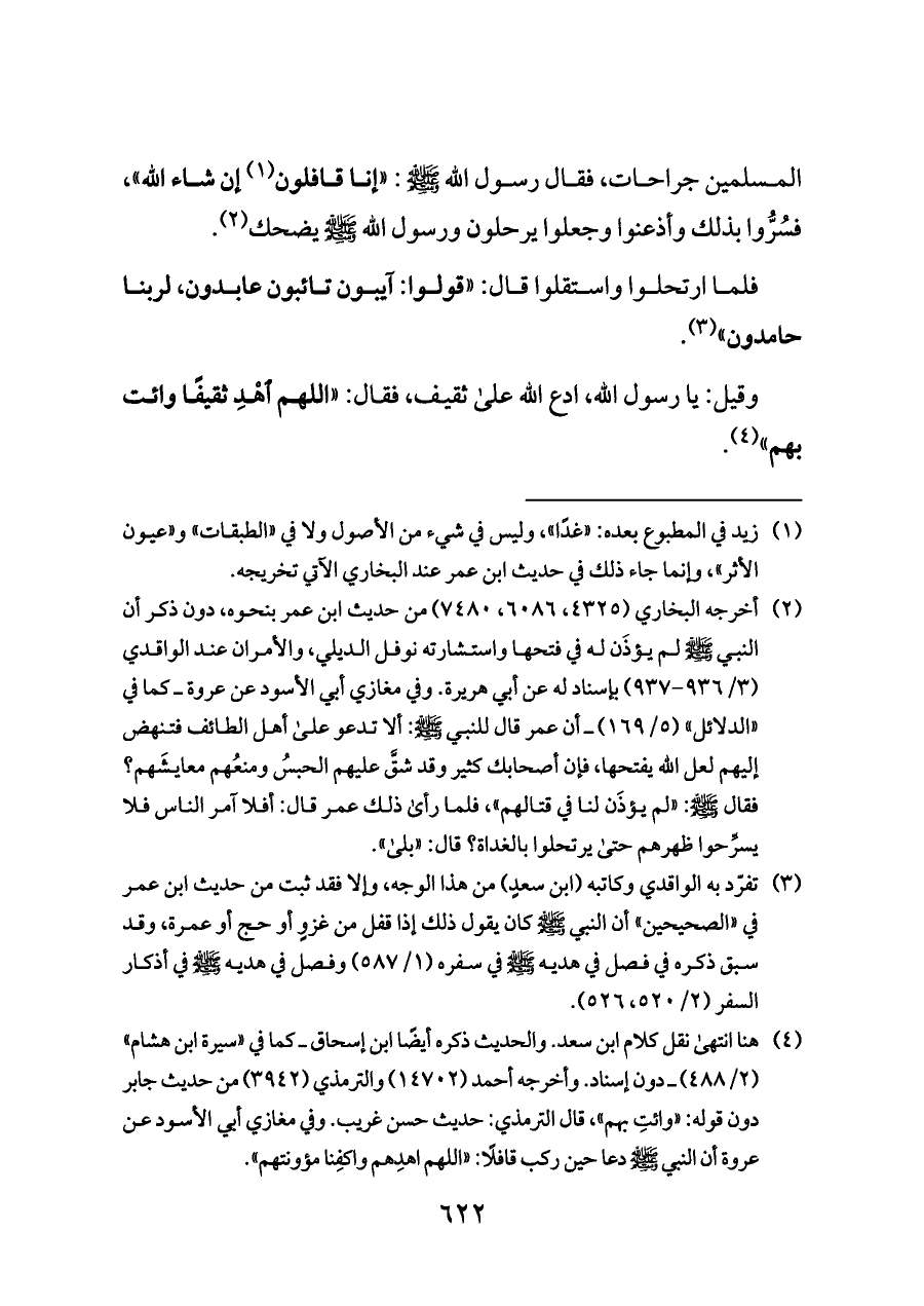 (¬٣) تفرّد به الواقدي وكاتبه (ابن سعدٍ) من هذا الوجه، وإلا فقد ثبت من حديث ابن عمر في «الصحيحين» أن النبي - صلى الله عليه وسلم - كان يقول ذلك إذا قفل من غزوٍ أو حج أو عمرة، وقد سبق ذكره في فصل في هديه - صلى الله عليه وسلم - في سفره (١/ ٥٨٧) وفصل في هديه - صلى الله عليه وسلم - في أذكار السفر (٢/ ٥٢٠، ٥٢٦).